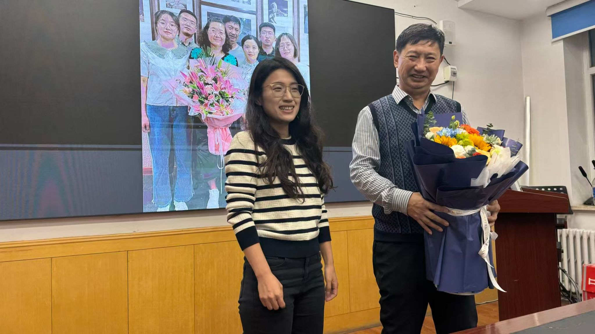 随后,仪式进入温情满满的致敬环节。院长代表学院为许嘉巍教授颁发了荣誉退休奖章,表彰其杰出的学术与服务贡献;书记代表学院向许教授赠送纪念礼品,表达学院的感念之情;学院工会主席郭蒙教授也送上工会的贴心礼物。从外地专程赶来的学生代表为许老师献上了鲜花,现场响起热烈而持久的掌声,表达着师生们发自内心的感激与不舍。