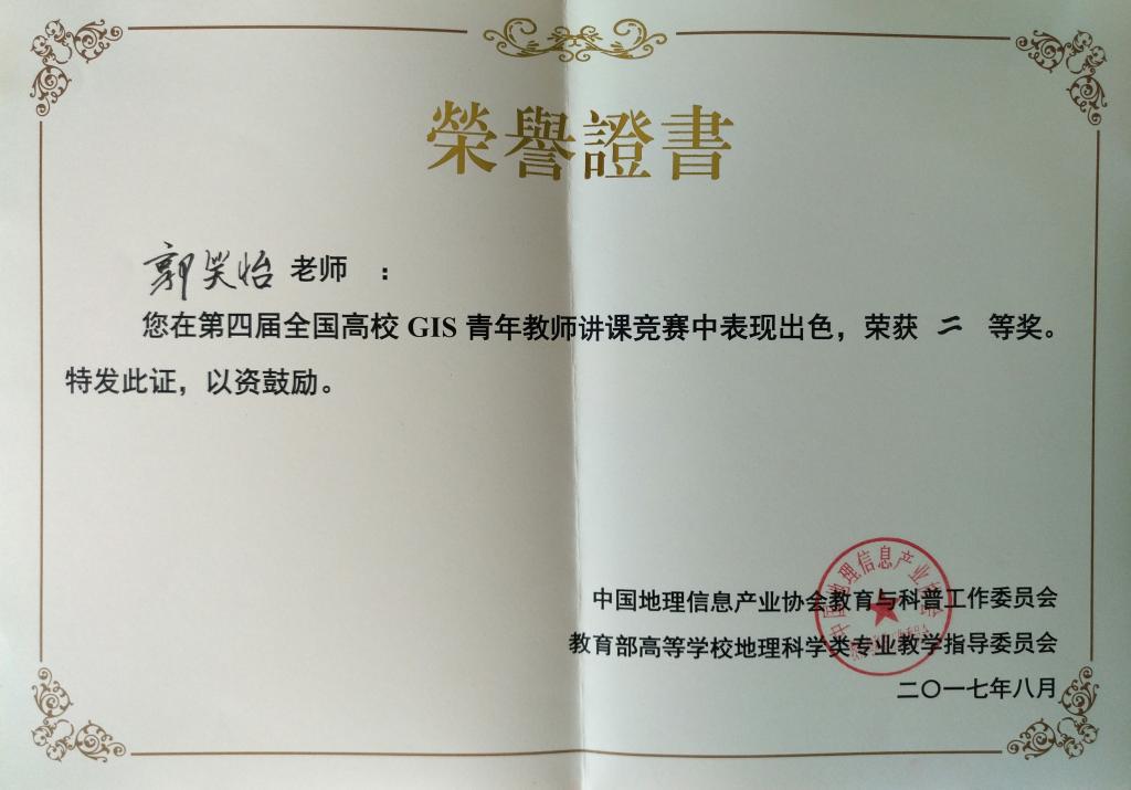 8月23-24日,第四届全国高校GIS青年教师竞赛在北京成功举办,yl9193永利集团教师郭笑怡作为代表参加竞赛,荣获“二等奖”。