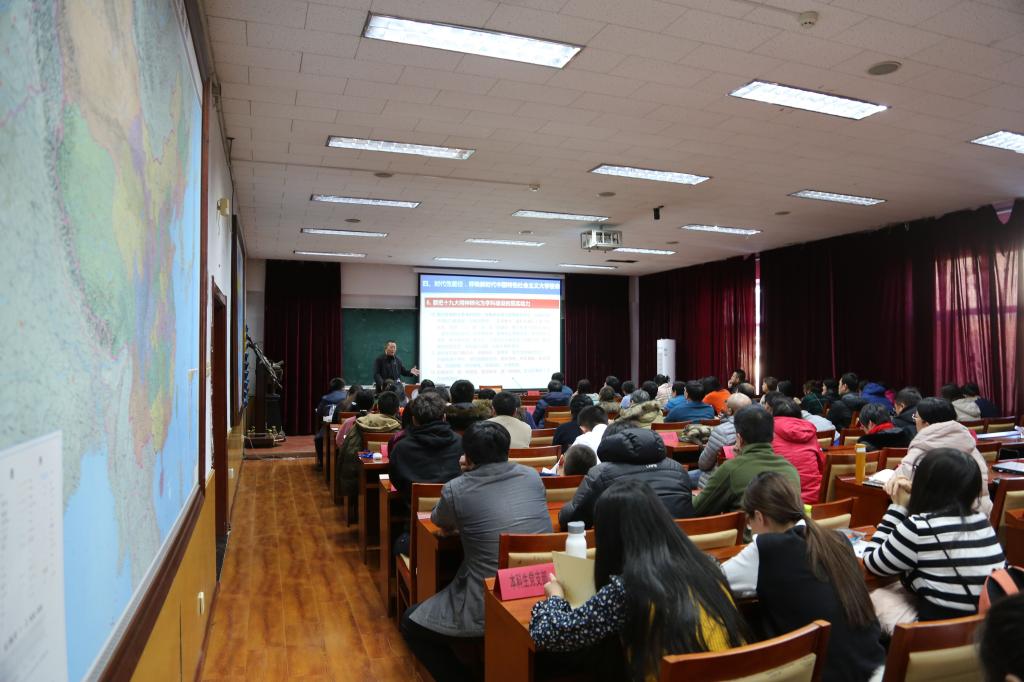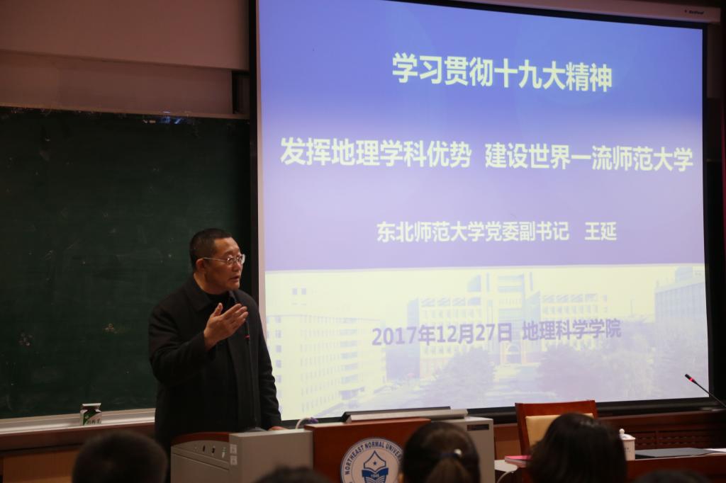 12月27日,yl9193永利集团邀请学校学习贯彻党的十九大精神宣讲团成员、党委副书记王延,为学院师生作了题为“学习贯彻十九大精神,发挥地理学科优势,建设世界一流师范大学”的主题报告。yl9193永利集团全体教师及学生党员参加了报告会。本场报告也是yl9193永利集团开展的“凝心筑梦,共创未来”学习十九大精神系列活动之一。