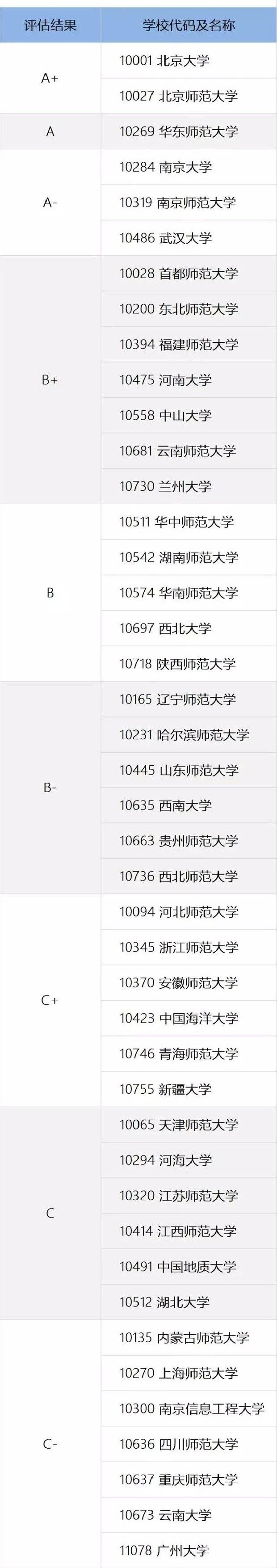 附:全国高校地理学学科评估结果(注:评估结果相同的高校排序不分先后,按学校代码排列。)