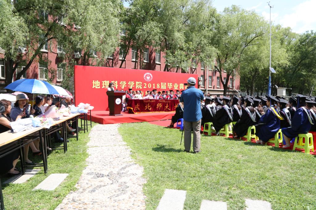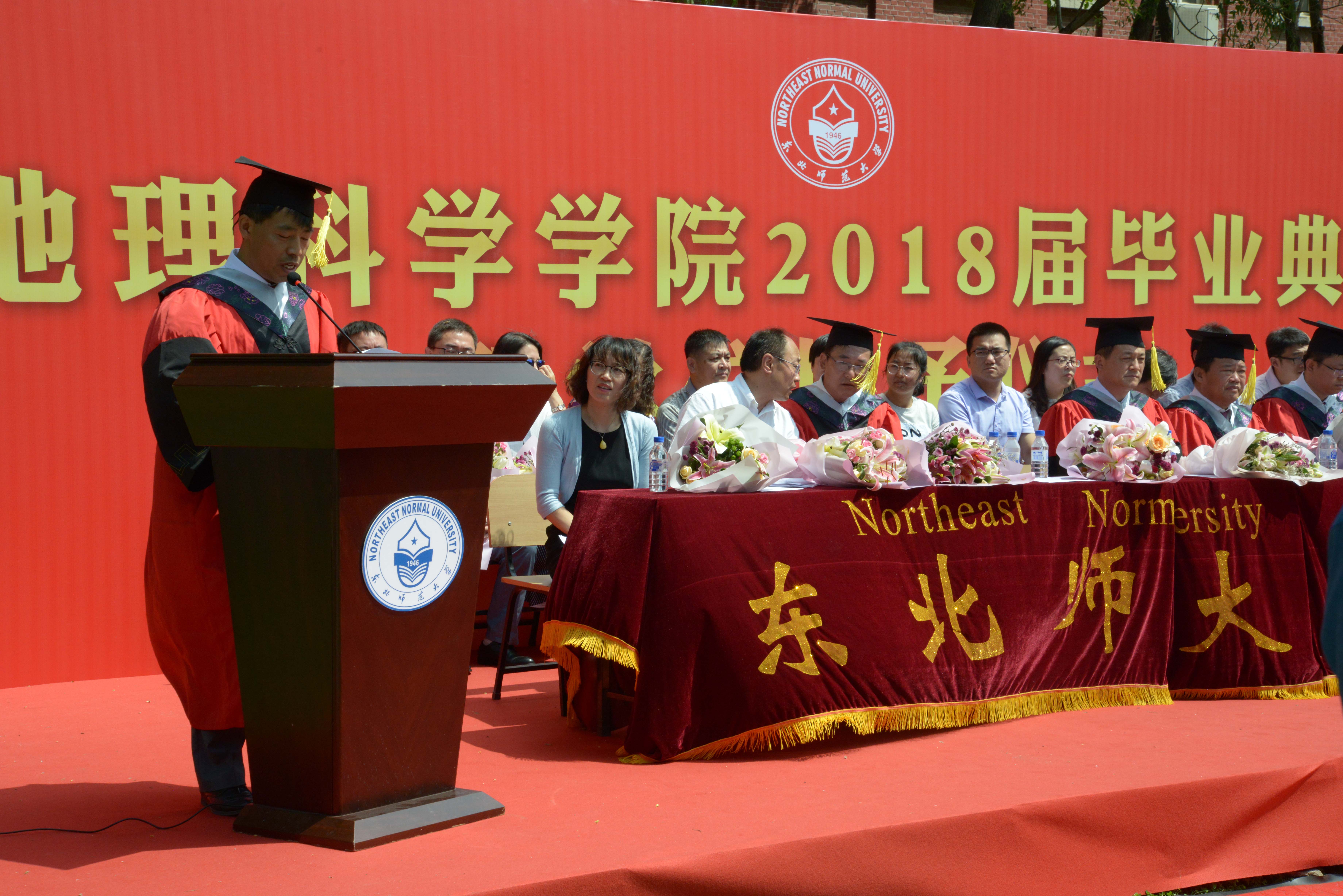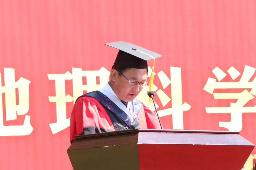 学院党委书记王升忠向2018届毕业生致辞。他代表远在阿尔卑斯山进行野外考察的吴正方院长、学院党政班子、学位委员会成员对全体2018届毕业生顺利完成学业、开启人生新征程,表示最热烈的祝贺,对含辛茹苦抚育大家成长的各位家长,对倾心尽力培育大家成材的全体教师,表示衷心的感谢和崇高的敬意。对毕业生提出“为学东师,以地理学问修博大襟怀;立业一方,向家国需求树高远宏志;德才兼备,承东师精神定立身之本”的殷切希望。最后,王升忠满怀深情地说:“地理学院永远是你们的家!孩子们,好好吃饭,累了就回家。”