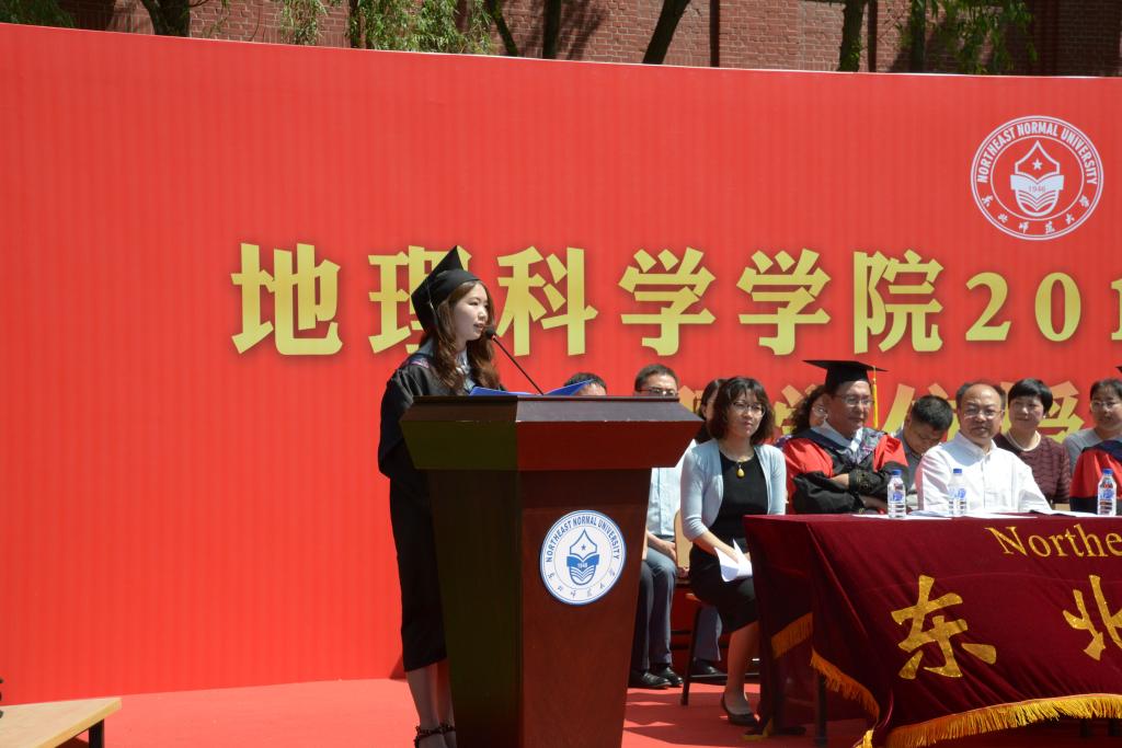 毕业生代表、地理科学公费师范专业毕业生、东师奖章获得者赵黎,代表全体毕业生发言。她回忆了几年来“鲜衣怒马里的大好年华,地科楼里的春秋冬夏”,抒发了同学们对母校的无限热爱和依念之情,表示每一位毕业生都会始终谨记“勤奋创新,为人师表”的校训,不忘“地载万物,理蕴乾坤”的精神。