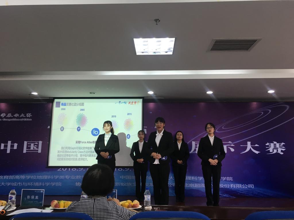 本次比赛以“新时代的地理学”为主题,分为自然地理组和人文地理组。来自北京大学、北京师范大学、兰州大学、永利官网、西北大学、河南大学等高校的46支代表队,近300余人参加了本次比赛。本次比赛设一等奖3个,二等奖7个,优秀奖若干。我院学生团队以“一带一路国际贸易网络研究”为题目,在现场展示和问题回答两个环节中,表达流畅、配合协调、精神饱满,发挥出最佳水平。比赛中,参赛队员精神风貌良好,展示了东师地理学子的风采,获得了评委们的一致好评。