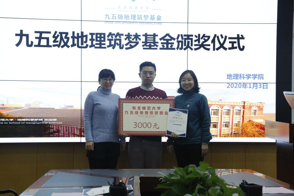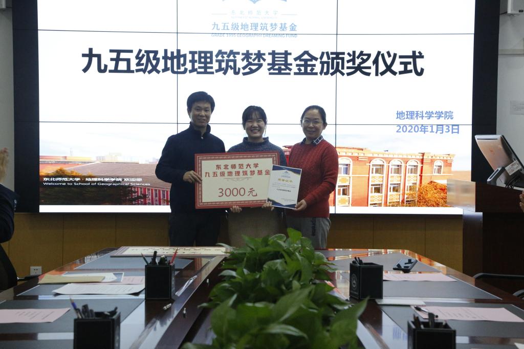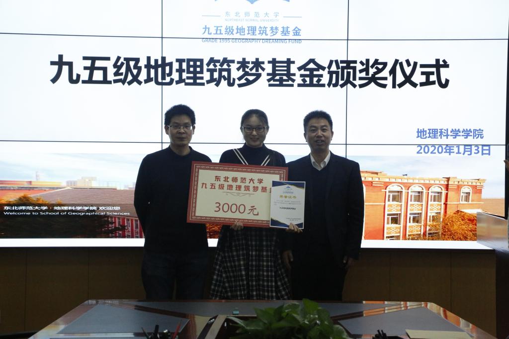 1月3日,新年伊始,“永利官网九五级地理筑梦基金”首届颁奖仪式在我院隆重举行。经过个人申请、学院推荐、基金委员会考核,2017级本科生王政、杨子力、张浩然成为该基金首批奖励对象。“九五级地理筑梦基金会”成员代表王向东、李鸿凯、卢珊、王平、赵伟、王海霞,yl9193永利集团党委书记王升忠、团委书记沈雯、辅导员雷钧婷出席了颁奖仪式。颁奖仪式由学院副书记兼副院长陈静主持。