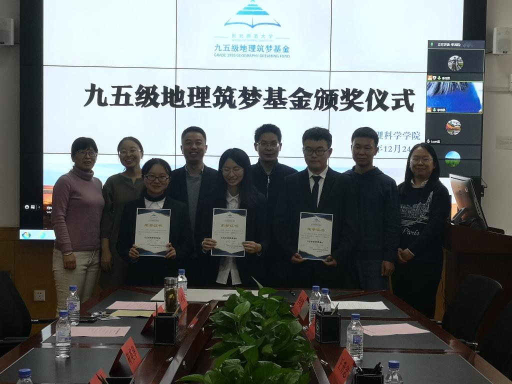 12月24日,永利官网九五级地理筑梦基金2020年度颁奖仪式在我院举行。学院党委书记王升忠教授,团委书记沈雯,辅导员隋蕙咛,九五级学生辅导员靳英华教授,基金会成员代表王向东、李鸿凯、卢珊、王平、赵伟、王海霞出席了颁奖仪式,九五级校友线上参加了颁奖仪式。经过个人申请、学院推荐、基金委员会考核,2018级本科生刘恩、甘玲、肖静获得2020年度九五级地理筑梦基金。