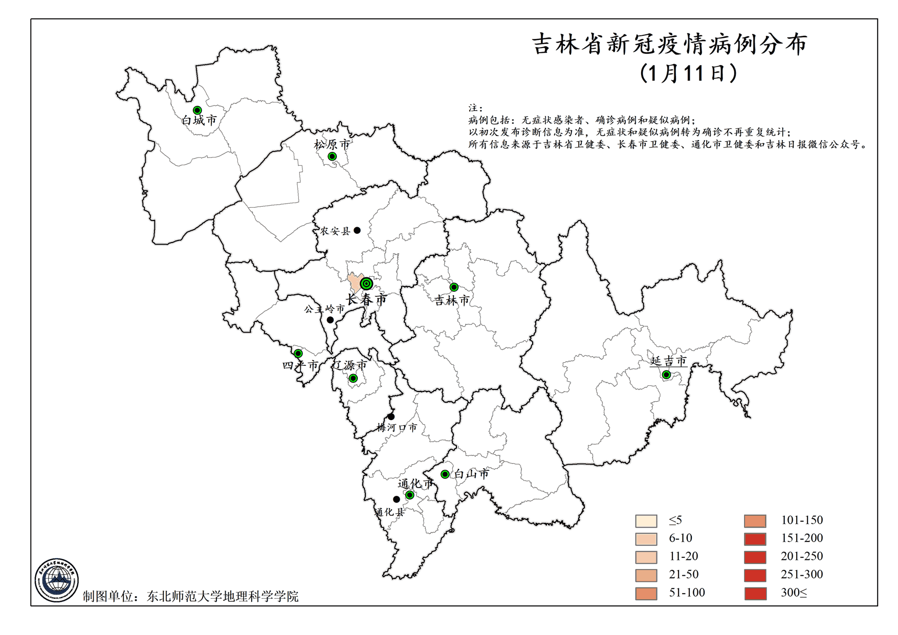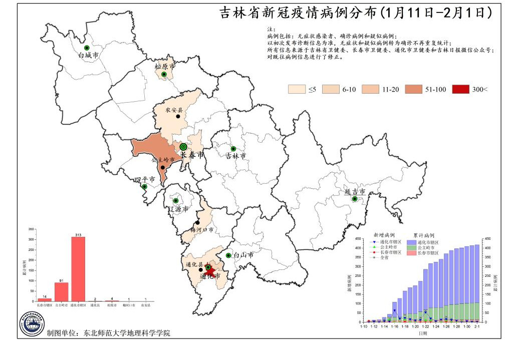 图2. 吉林省新冠疫情病例分布(1月11日-2月1日)