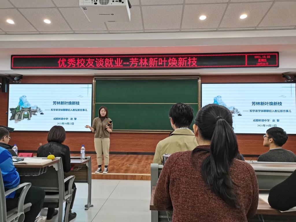 10月22日,我院校友、成都树德中学教师赵黎做客“优秀校友谈就业”分享会,带来一场题为“芳林新叶焕新枝——聊聊初入教坛那些事”的主题报告,近200名学生参与本次活动。