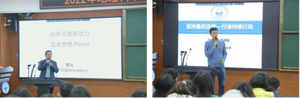 活动中,汪祖丞以“困惑地理、魅力地理、大爱地理——从学十年到从教十年”为题,谈到地理学习的经验、对地理学科的理解和对地理教师的认识,讲述了从困惑地理到魅力地理再到大爱地理的过程。魏冶以“培养自我驱动力,追逐梦想不emo”为题,从自身成长、学习和工作经历出发,分享了如何进行选择、如何应对焦虑以及多线程处理问题和时间管理的方法,鼓励同学培养自我驱动力,勇敢追逐梦想。孙仲秋以“坚持最初选择,付诸持续行动”为题,将个人成长融入到地理信息科学专业发展的之中,详细介绍了专业教师与研究特色,并分享个人在成长过程中的坚持和行动,引导同学们坚定初心,付诸努力。