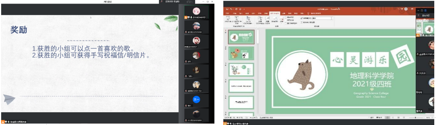 为缓解同学们期末考前压力,在年级朋辈辅导员的带领下,2021级各班组织开展“释放压力、游乐心灵”主题心理团辅,旨在调动同学们的学习积极性、拉近同学间距离,舒缓期末备考压力。本次心理团辅各班利用线上平台,分享心理减压方法,开展“成语接龙”“看图猜词”“影视复刻”“猜歌名”“猜影视作品”等线上互动环节。同学们表现得积极活跃、状态轻松,精彩回答层出不穷,活动氛围轻松愉悦,效果良好。