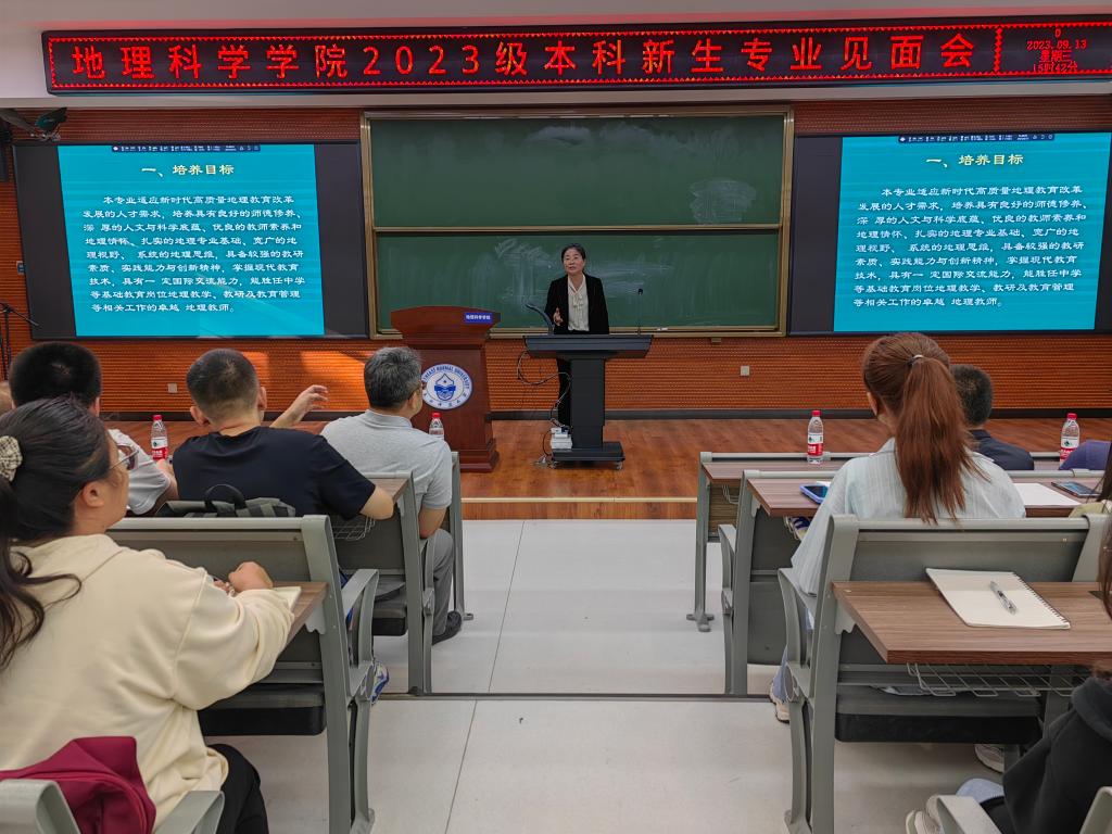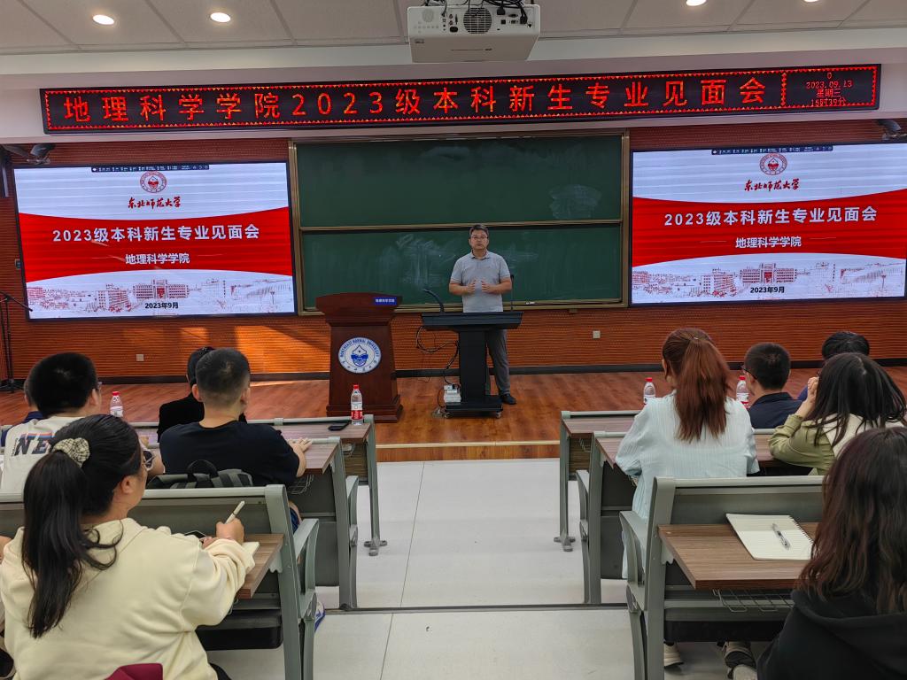 2023年9月13日,我院在地理大教室针对2023级本科新生进行了专业解读见面会。地理科学(公费师范)专业系主任娄晓黎、自然地理与资源环境系主任宗盛伟、人文地理与城乡规划系主任王昱、地理信息科学党支部书记赵建军四位老师应邀为同学们进行专业解读。会议由党委副书记兼副院长杨成岭主持。