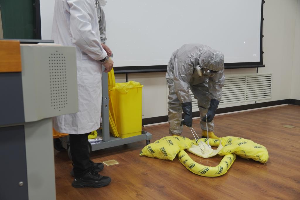 在应急演练环节,刘存模拟实验室危险化学品丙酮的泄露情景,指导学生遇到这种情形的具体操作规程,如何准确的向实验室负责老师汇报,并逐步指导学生正确穿戴防护用具,妥善处理泄漏药品,规范处置废弃物品,全程演示了实验室危险化学品泄漏的安全应急流程并进行了详细讲解。