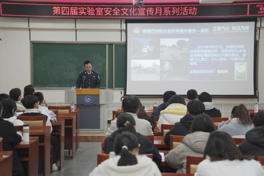 11月1日,我院举办2023年度“实验室安全活动月”系列活动之实验室易制爆危险化学品管理安全讲座及实验室安全应急演练活动。活动邀请到吉林市公安局治安管理支队二级警长计永刚做实验室易制爆危险化学品管理讲座,埃德伯格实验室EHS研究中心讲师刘存做应急演练全程讲解。yl9193永利集团副院长宋飏,我院相关专业教师、实验室负责人,及拟申请进入实验室的硕博新生70余人参加了活动。本次活动由学院实验室安全管理员刘莎莎老师主持。