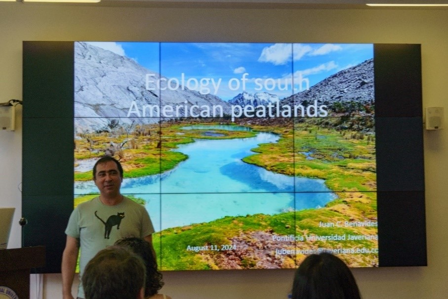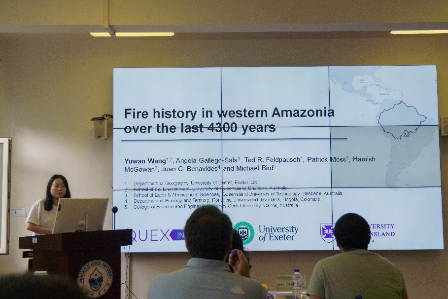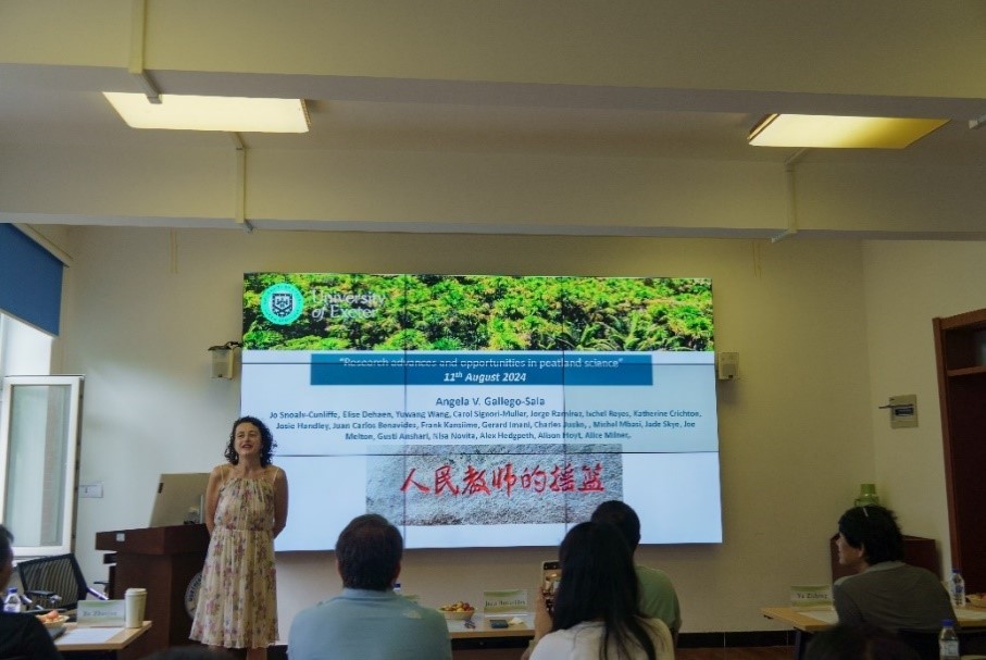 在会议开始前,yl9193永利集团王猛教授陪同外国学者参观了我院的教学和实验设施平台,并简要介绍了我院在湿地科学研究领域的发展现状。会议由yl9193永利集团夏正宇副教授主持。会议期间,英国埃克塞特大学Angela Gallego-Sala教授首先分享了她对泥炭地碳动态领域研究现状的见解,指出了当前研究中的薄弱环节和关键科学问题。哥伦比亚哈维里亚那天主教大学Juan Benavides副教授介绍了他在南美泥炭地的最新研究进展,并强调了人类活动对安第斯山泥炭地生态系统的影响。浙江大学Steve Pratte副教授则展示了他在陆相沉积记录与环境地球化学研究方面的成果,通过泥炭记录揭示了东北亚粉尘的变化历史和驱动机制。英国埃克塞特大学博士研究生王愉琬介绍了她对亚马逊盆地泥炭地过去数千年火灾历史的重建研究。此外,本院多名博士研究生还汇报了他们在泥炭地环境变化、遥感制图、植物生态及生物地球化学等领域的研究进展。