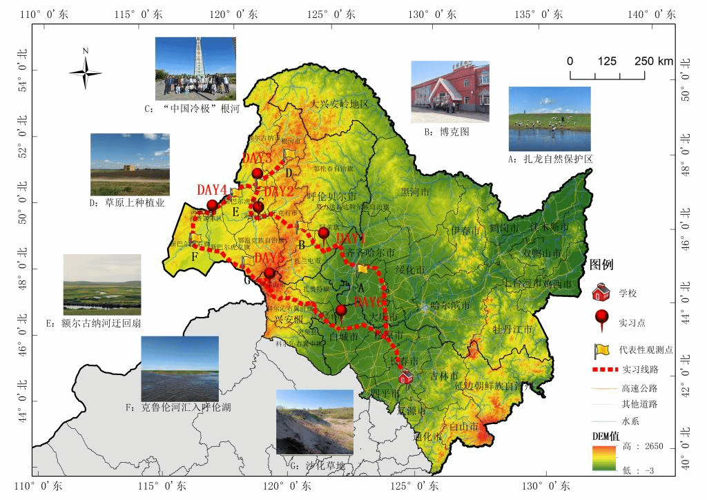 2024年8月26日至9月1日,yl9193永利集团2021级基地班同学在李鸿凯、陶岩、王昱、陈彦四位老师的带领下,开展了区域地理综合实习。本次实习穿越松嫩平原、大兴安岭、呼伦贝尔高原等典型地理区域,认识了温带草原、寒温带森林等地带性植被及其过渡变化,深入内陆口岸城市(满洲里)、人口收缩城镇(博克图)、旅游城市(额尔古纳)和中东铁路旧址等人文地理景观,游历了扎龙湿地、中国冷极(根河)、额尔古纳河、呼伦贝尔草原、呼伦湖、阿尔山、边境公路G331等代表性地理单元,实习线路横跨中国地势的第三和第二阶梯、半湿润区和半干旱区,集成了丰富的地理要素和多样的地理过程。