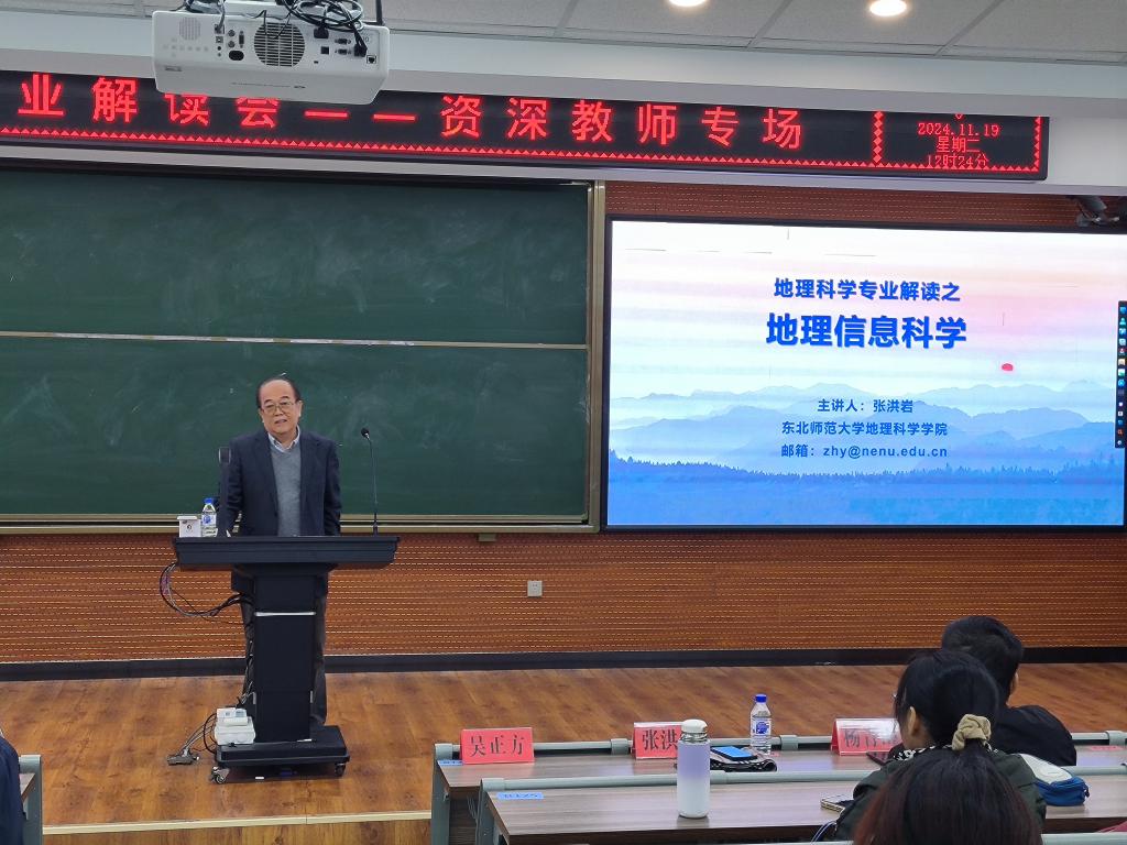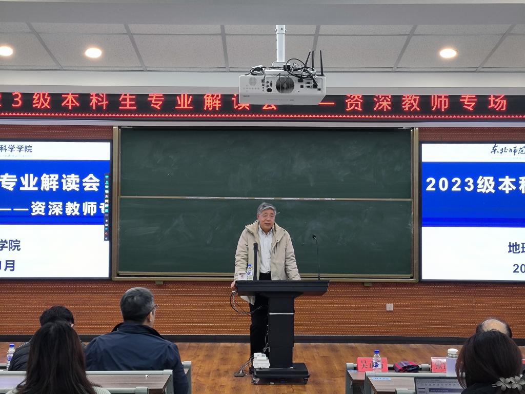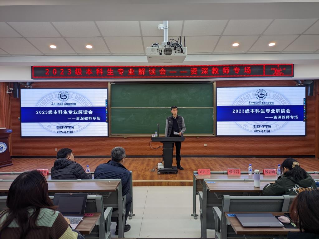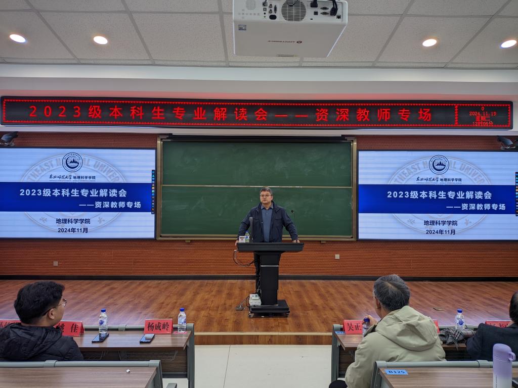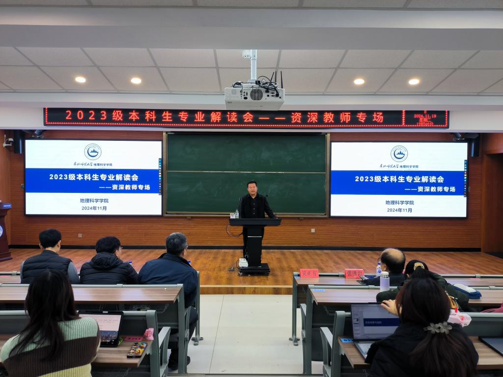 2024年11月19日,yl9193永利集团举办2023级本科生专业解读会之资深教师专场。邀请到资深教师吴正方、张洪岩和杨青山三位教授为同学们带来更深层次、全新视角的专业解读。学院副院长孙仲秋、辅导员姚佳和2023级地理科学类专业学生参加了本次会议。会议由学院党委副书记兼副院长杨成岭主持。