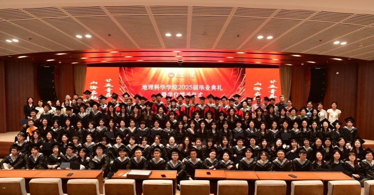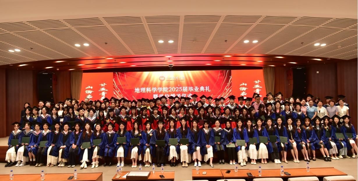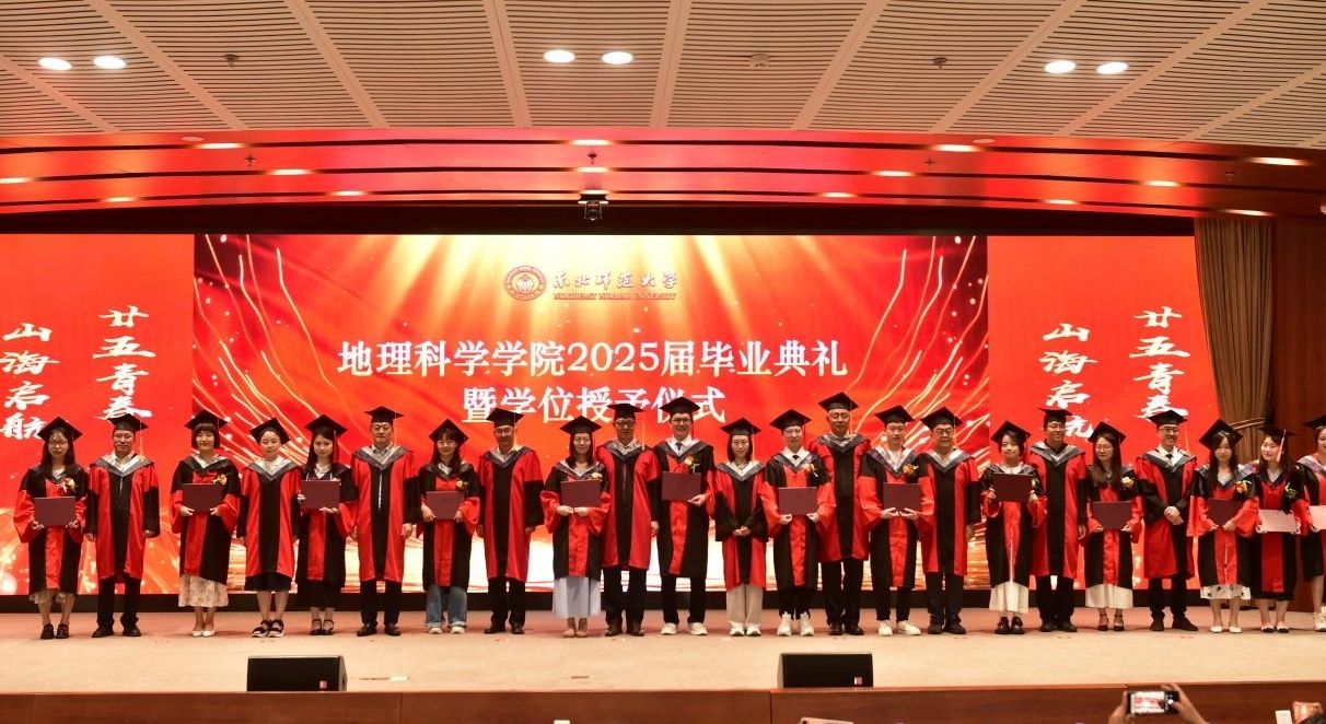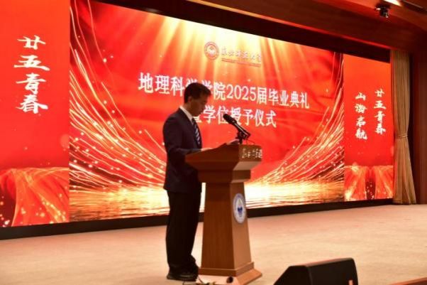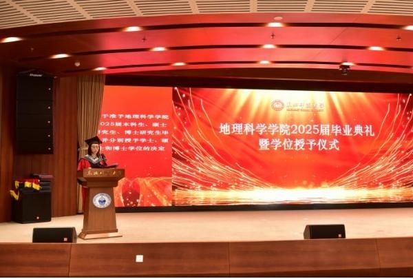 教师代表吴正方教授在发言中首先对全体毕业生顺利毕业表达了热烈的祝贺,将“教书育人”“巧夺天工”和“家国天下”三个关键词赠予毕业生,希望地理学子在未来的工作和学习中要坚守教师言传身教的育人宗旨、追寻自然之美并尊重自然规律、秉承地理学和地理学者的情怀与责任担当,并对毕业生送上了“人生精彩、前程锦绣”美好的祝福。2025届地理科学专业本科生王名扬代表全体毕业生上台发言,她回顾了自己的成长历程,表达了对学院领导、老师和同学们的感激之情,表示地理全体毕业生将牢记学院的教诲,以饱满的热情和坚定的信心迎接未来的挑战,努力实现自己的人生价值,为党和国家做出地理人应有的贡献。之后,2025届本科毕业生为学院献上印有毕业生指纹“大树”象征意义的纪念品。