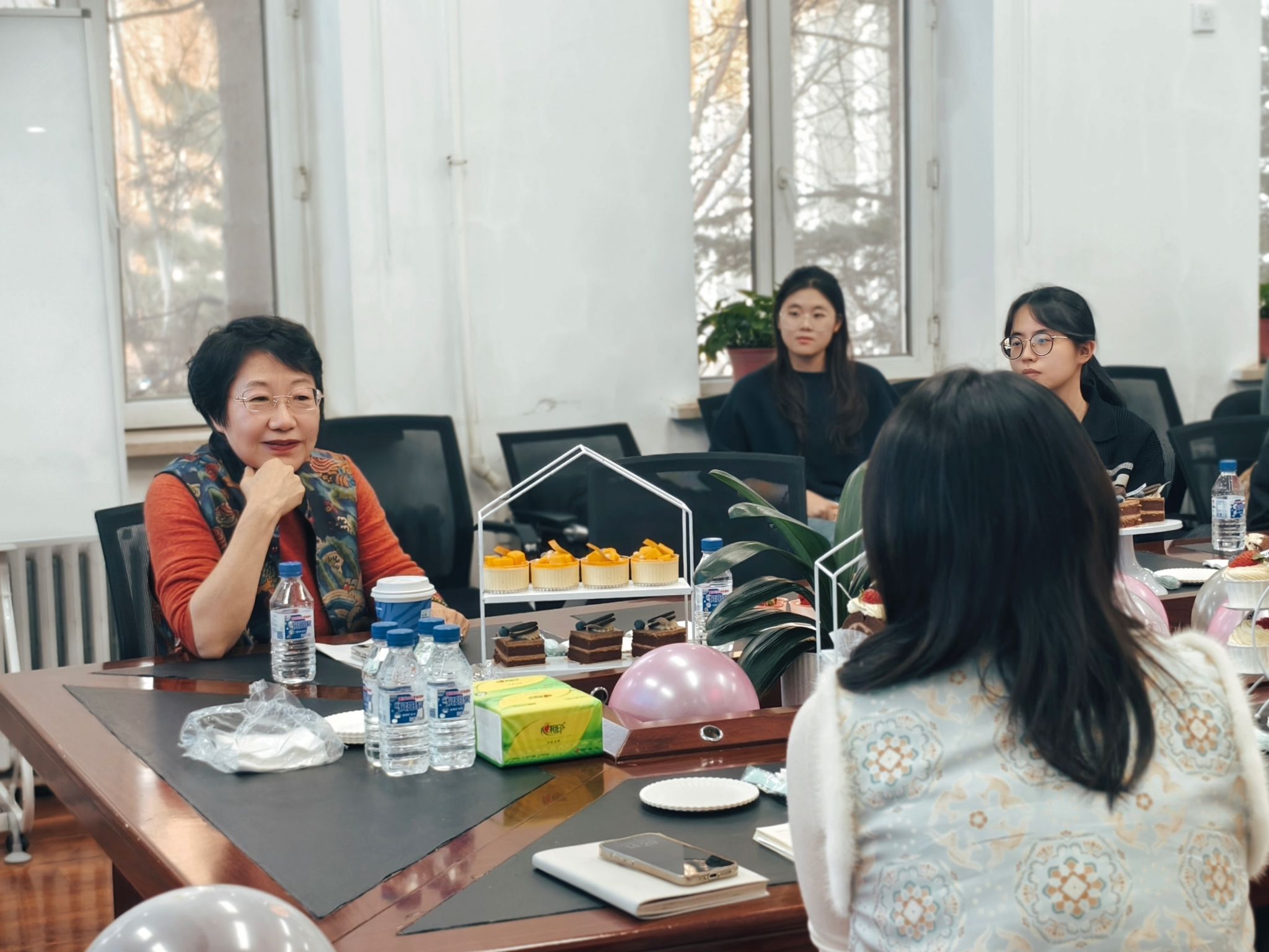 在互动环节,梅林老师就青年人普遍关心的内卷现象及压力疏导等话题与同学们进行交流,并结合时代背景与个人阅历,勉励青年学子珍惜当下、勇于追梦,鼓励全体师生面对挑战保持乐观、敢于突破。活动最后,学院为梅林老师颁发“经纬银晖”薪火宣讲团特聘教师证书。与会师生簇拥梅老师合影留念,将这份跨越时空的师生情谊与精神传承定格为永恒瞬间。