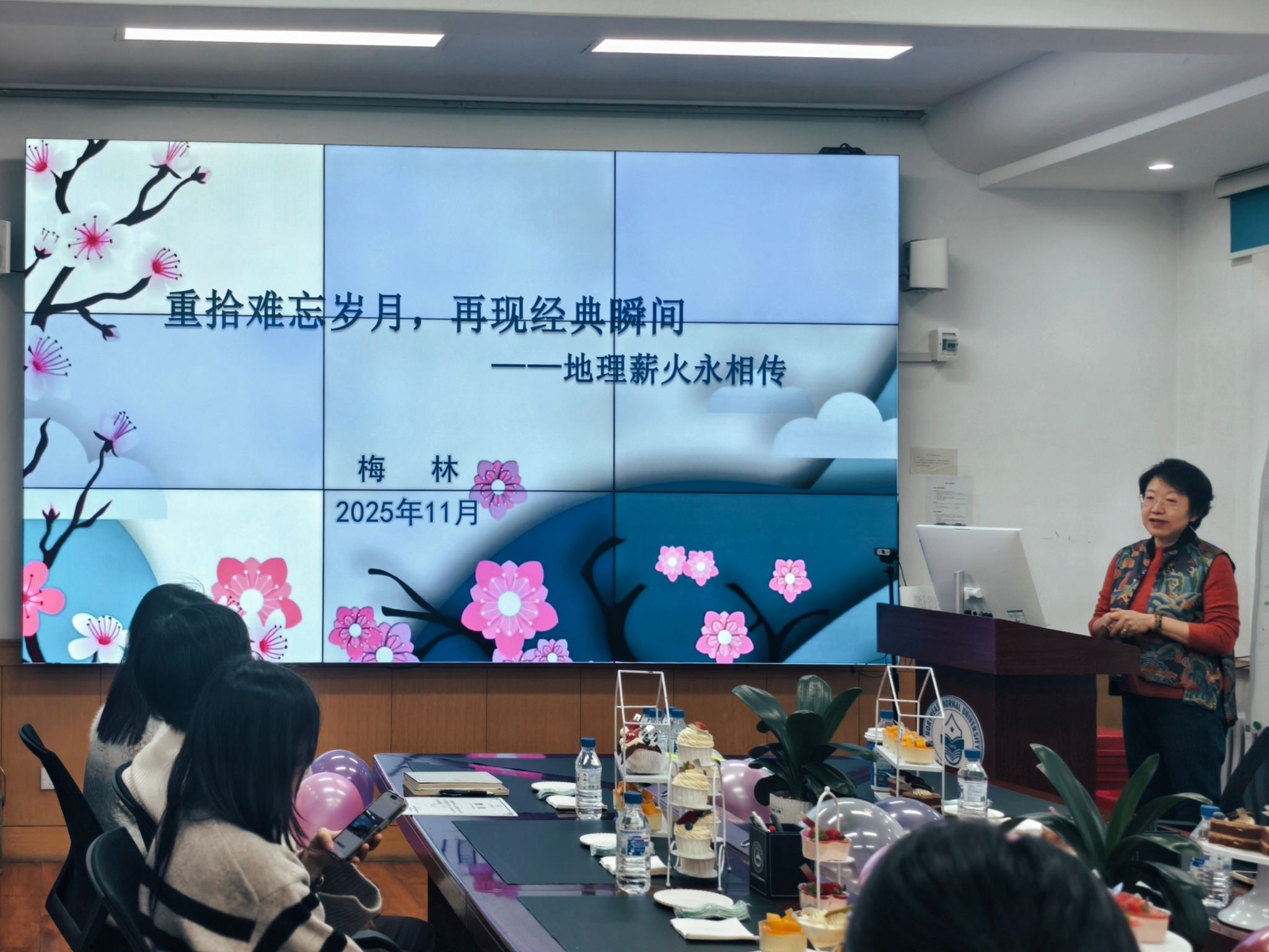 作为学院建设与发展的亲历者与见证人,梅林老师结合四十余载执教生涯,以一张张泛黄的老照片、一段段鲜活的人生经历,围绕“峥嵘岁月:学无止境”“无怨无悔:一生从教”“责无旁贷:服务社会”“薪火相传:寄语青年”四个篇章,深情回顾了扎根地理学科的成长点滴,系统梳理了学院在课程设置、实习实践等方面的发展脉络,并重点介绍了学院资深专家与知名学者的学术贡献。梅老师娓娓道来,将学院在学科建设、人才培养与社会服务等方面的点滴进步,凝练为一个个动人故事,让在场师生深刻感受到几代地理人“脚踏实地、仰望星空”的执着追求与深厚情怀。
