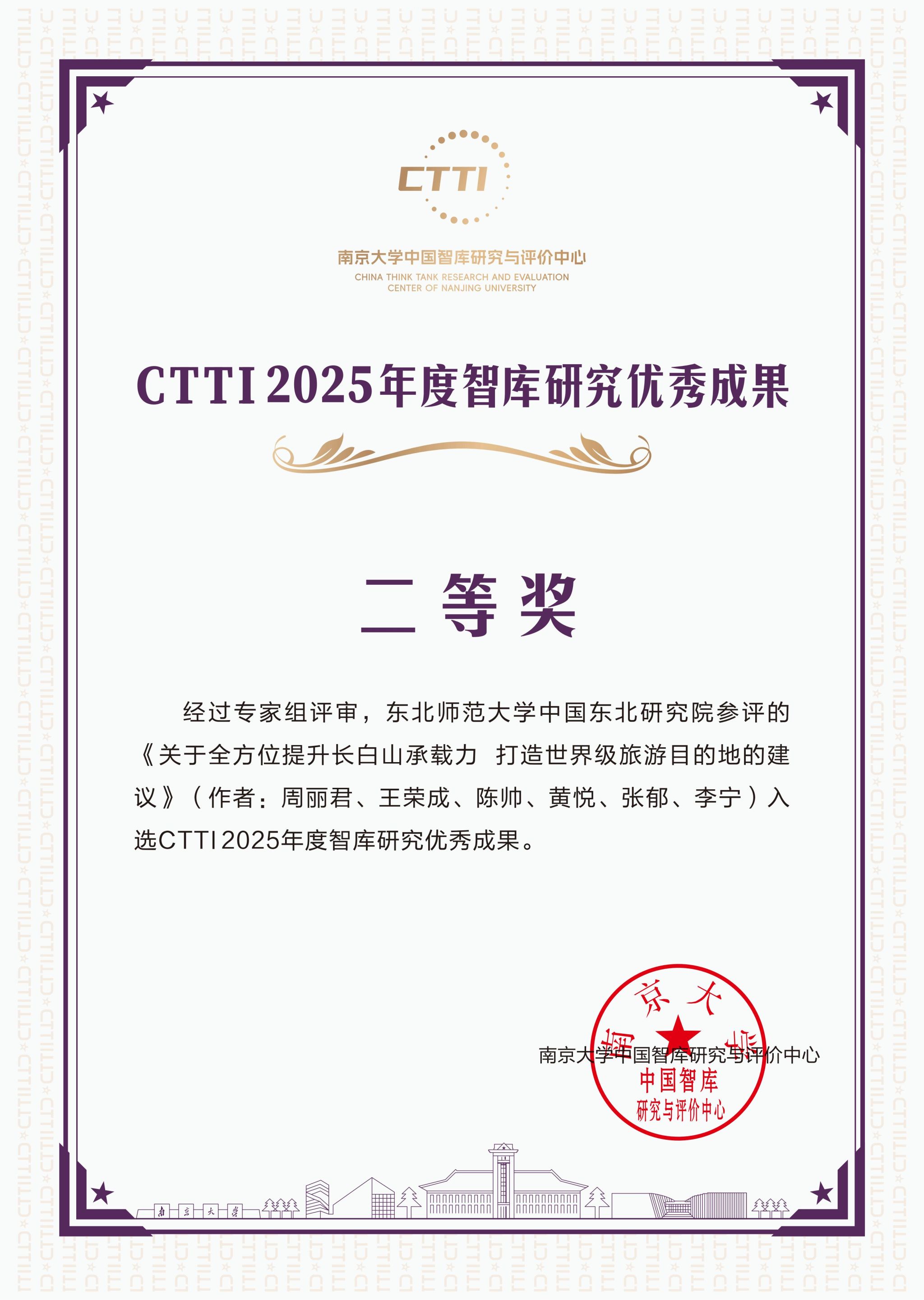 近日,中国智库索引(CTTI)“2025新型智库治理论坛”在江苏省南京市举办,会上发布了2025年度CTTI智库建设最佳案例与智库研究优秀成果获奖名单。永利官网中国东北研究院参评的三项成果均入选,其中,《智库引领,模式创新:以乡村建设评价构建乡村振兴发展的“吉林路径”》荣获“智库建设标杆案例”;《关于全方位提升长白山承载力 打造世界级旅游目的地的建议》及《“十五五”时期推进吉林省区域高质量协调发展路径研究》两项成果均获评“智库研究优秀成果二等奖”。