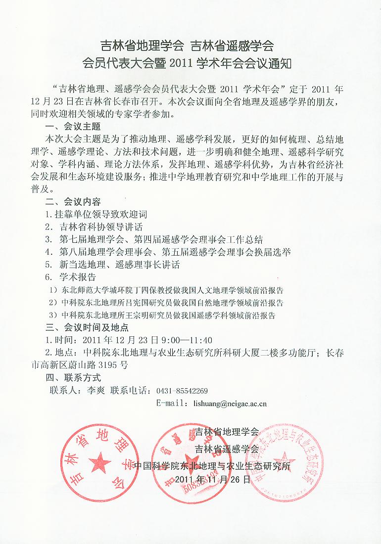 1.乘车时间:2011年12月23日 8:00,有意参会的老师可在城环学院门前统一乘车到地理所,也可自行前往; 2.开会时间:2011年12月23日9:00-11:40; 3.地点:中科院东北地理与农业生态研究所科研大厦二楼多功能厅;长春市高新区蔚山路3195号。 联系人:李爽