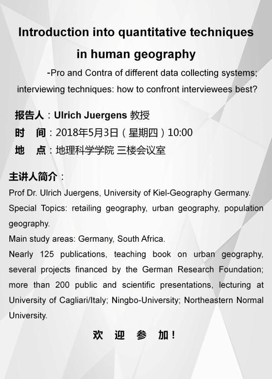 Ulrich Juergens: Introduction into quantitative techniques in human geography-Pro and Contra of different data collecting systems; interviewing techniques: how to confront interviewees best?