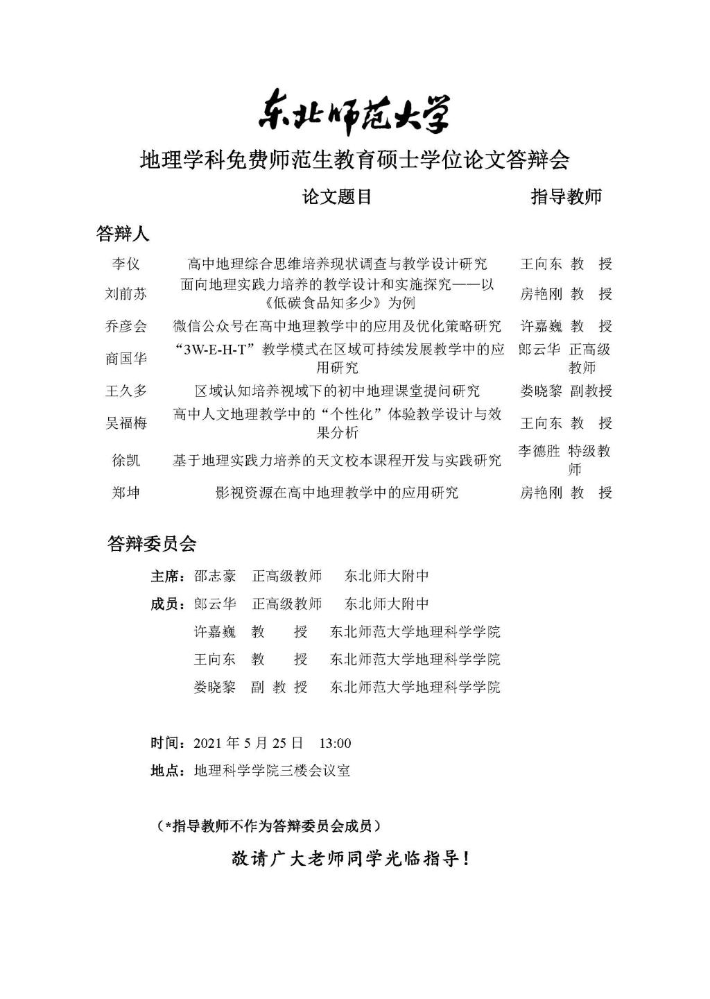 【硕博答辩】地理学科免费师范生教育硕士学位论文答辩