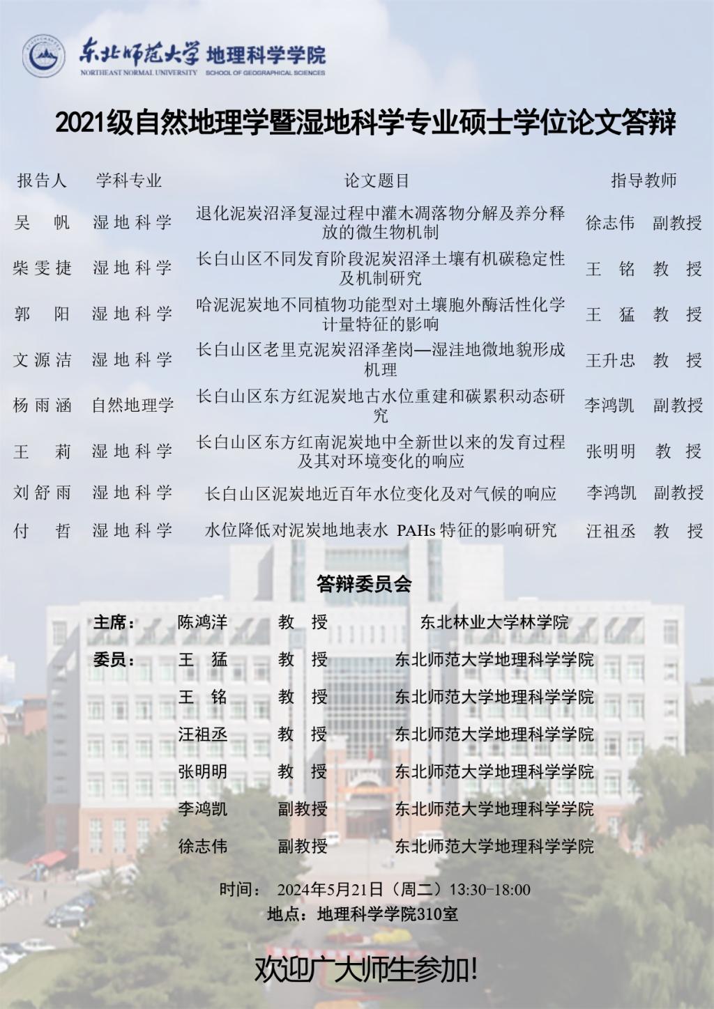 【硕博答辩】2021级自然地理学暨湿地科学专业硕士学位论文答辩