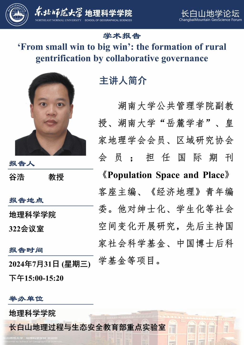 【长白山地学论坛(第六期)】 谷浩:‘From small win to big win’:the formation of rural gentrification by collaborative governance