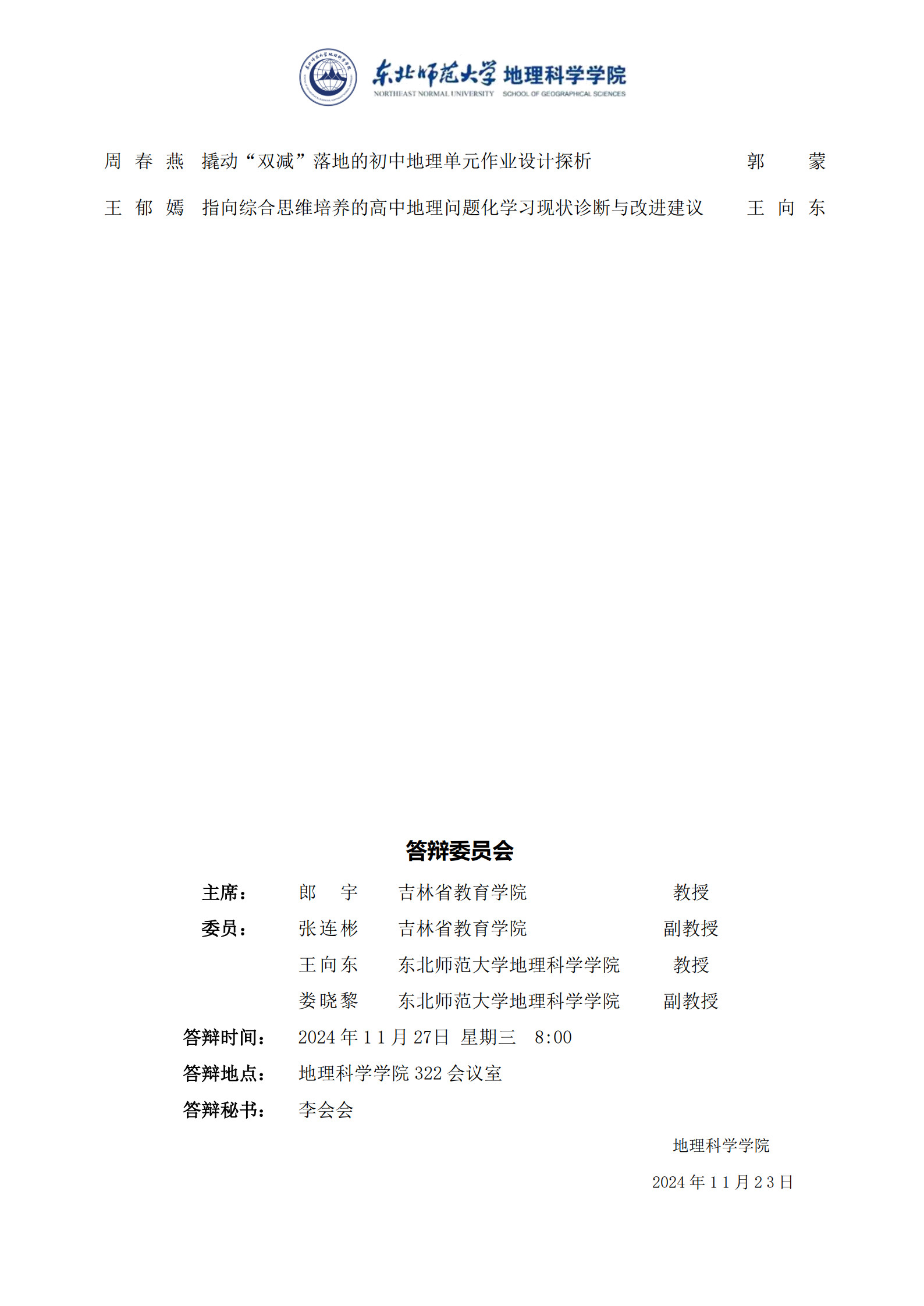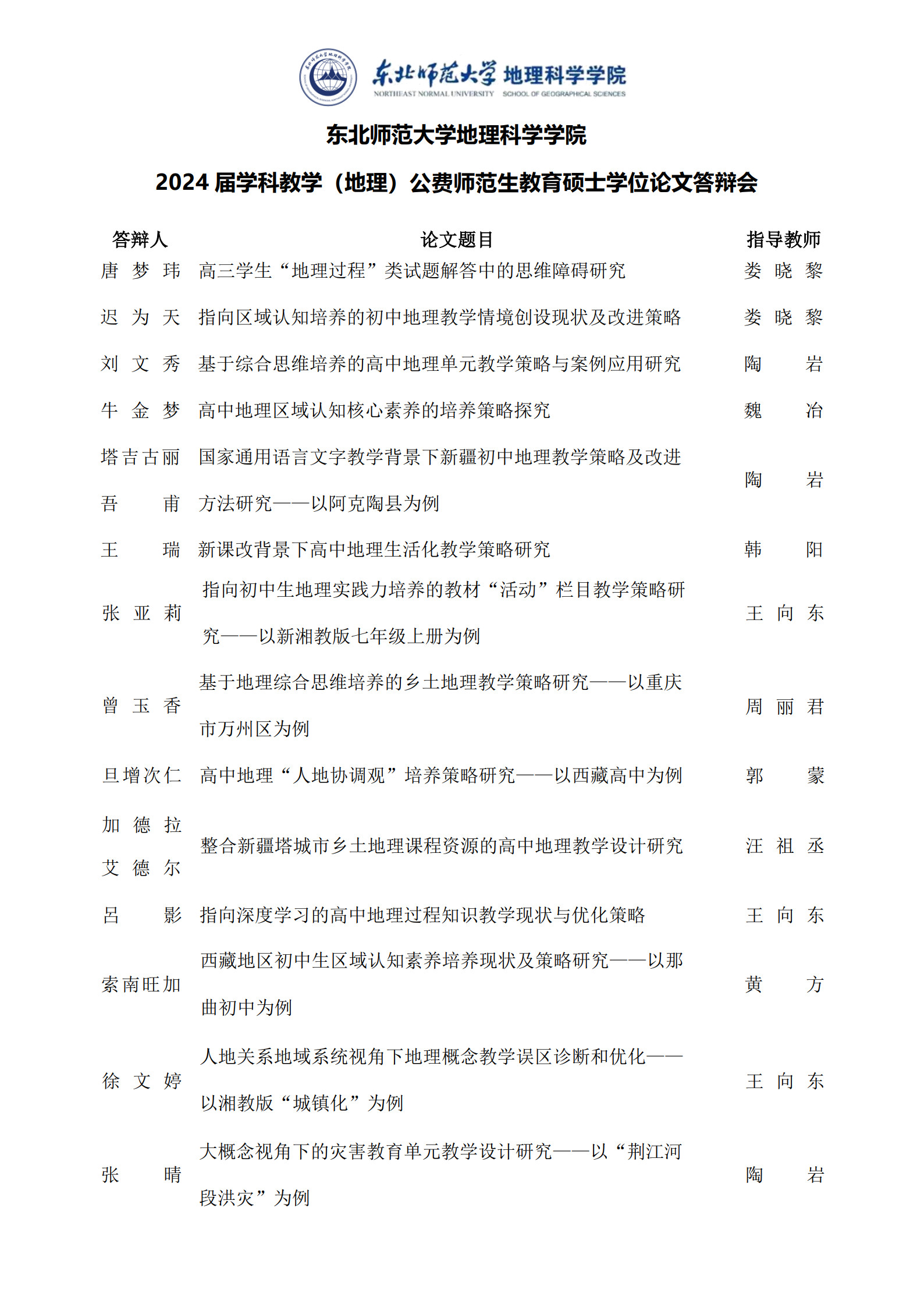 【硕博答辩】yl9193永利集团2024届学科教学(地理)公费师范生教育硕士学位论文答辩会