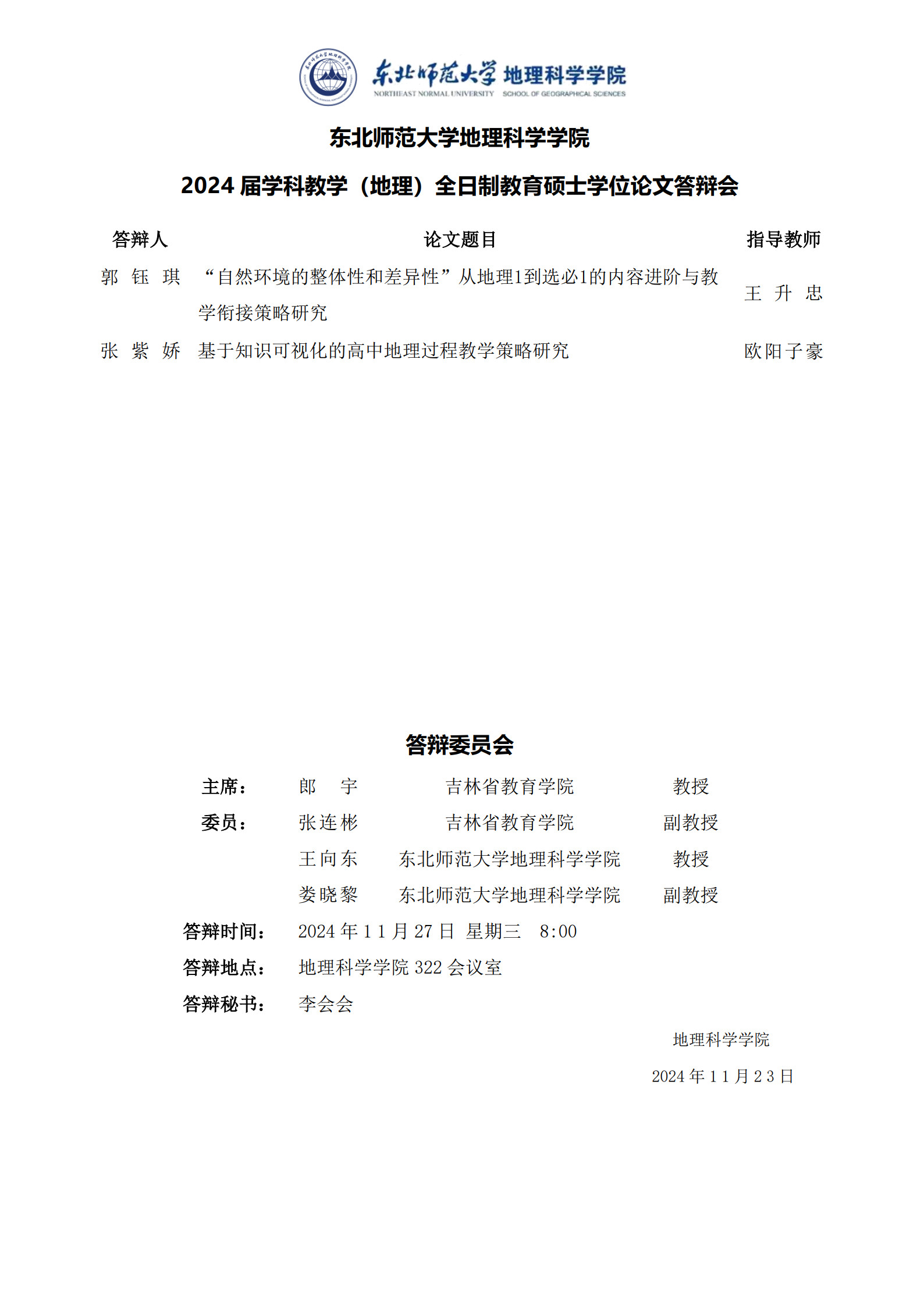 【硕博答辩】yl9193永利集团2024届学科教学(地理)全日制教育硕士学位论文答辩会