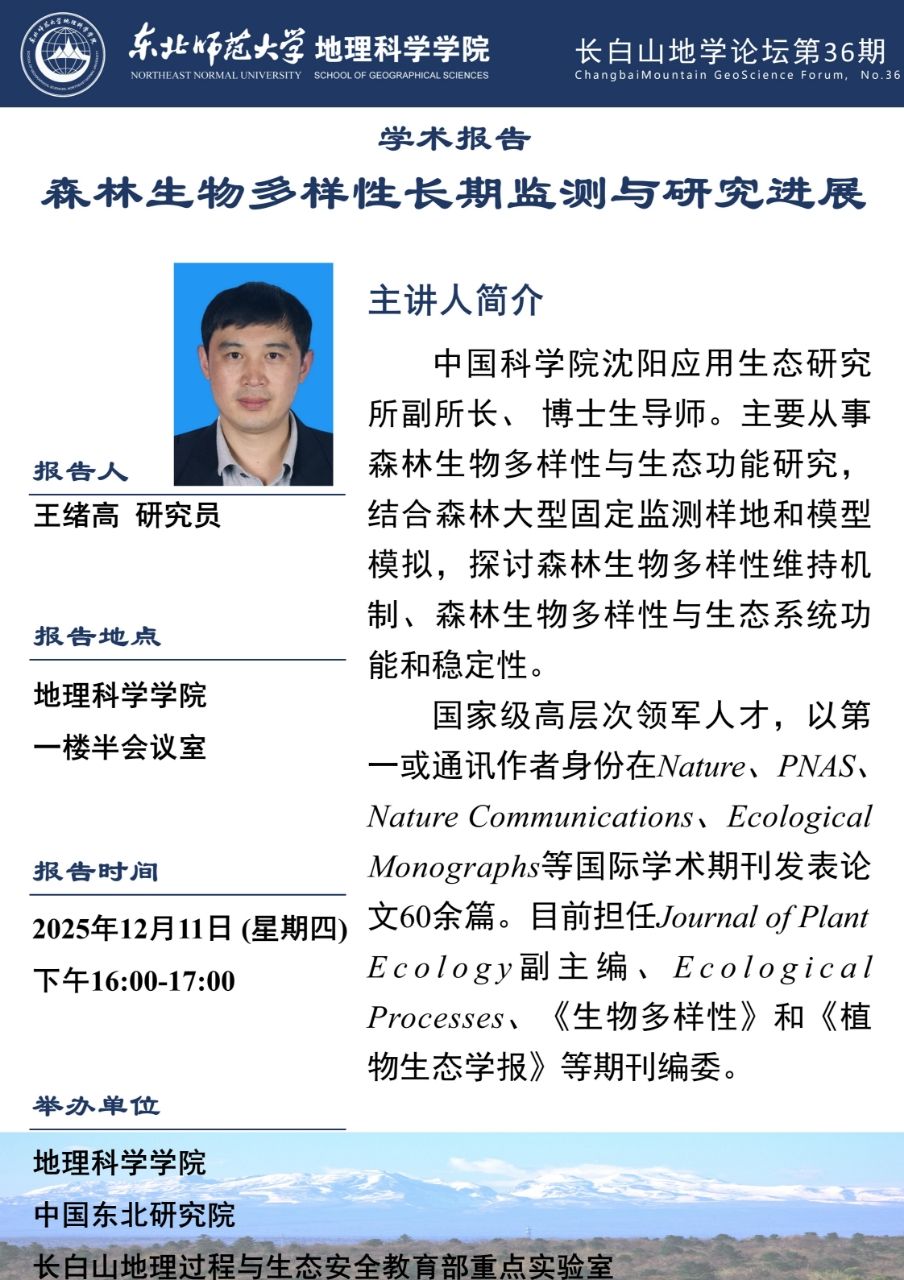 【长白山地学论坛(第三十六期)】王绪高:森林生物多样性长期监测与研究进展