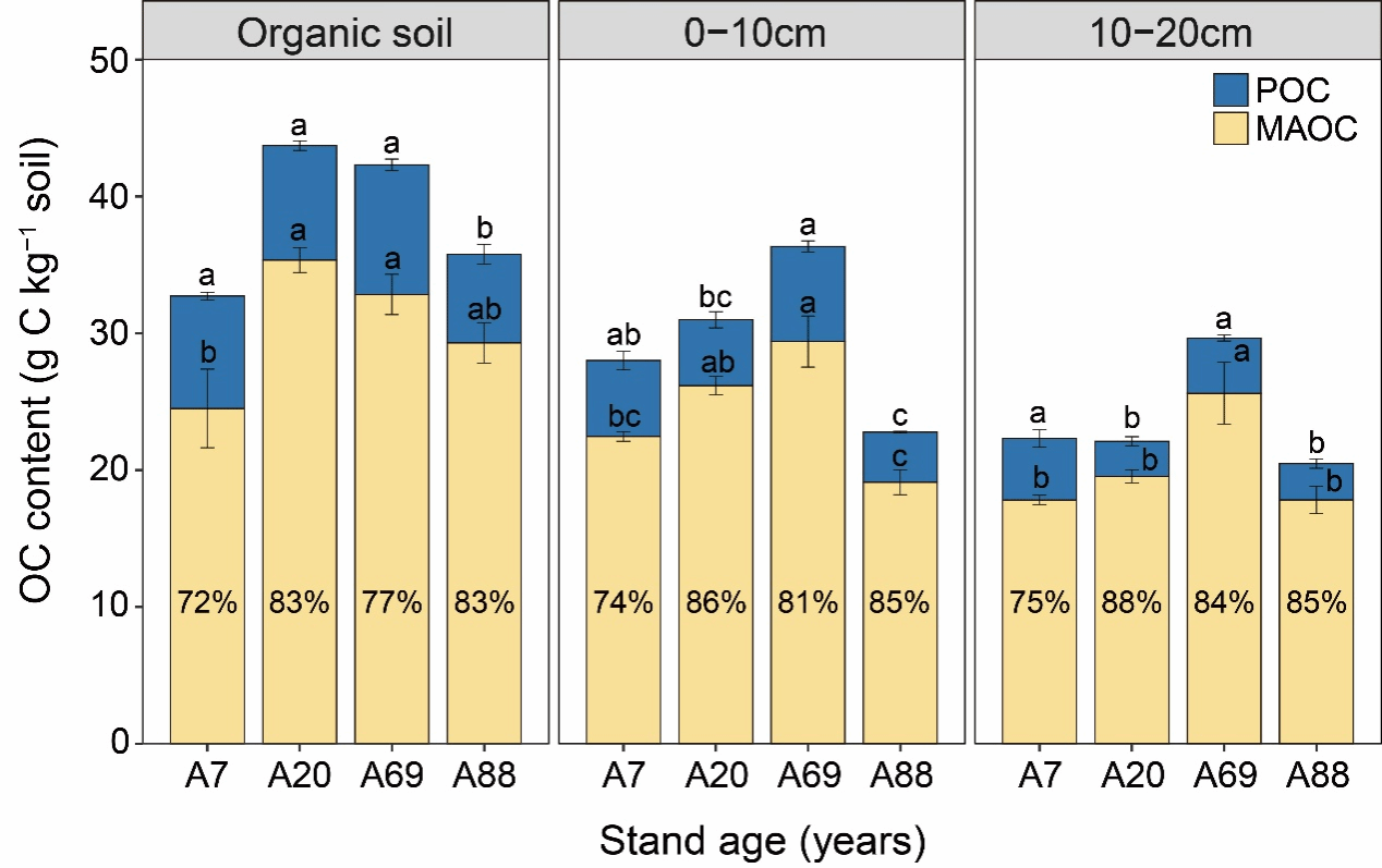 本研究结果表明,红松人工林土壤碳储量随林分发育呈非线性变化,并非持续增加,而是在近熟林(69年)达到峰值后,于成熟林(88年)阶段出现下降。进一步分析发现,有机层矿物结合态有机碳(MAOC)在约 20 年后进入平台期,矿质土壤 MAOC 在近熟林达到峰值,反映出矿物结合态碳受到物理化学容量限制,后期新增有机碳难以有效转化为长期保存形态,而主要以颗粒态有机碳(POC)形式积累。同时,随着林分成熟,土壤微生物群落由r-策略者向K-策略者转变,细菌逐渐占据主导地位。相比真菌残体,细菌残体在矿物表面的结合能力较弱且更易分解,这种微生物群落演替降低了微生物残体向稳定碳库转化的效率,从而限制了成熟林阶段土壤碳的进一步固存。