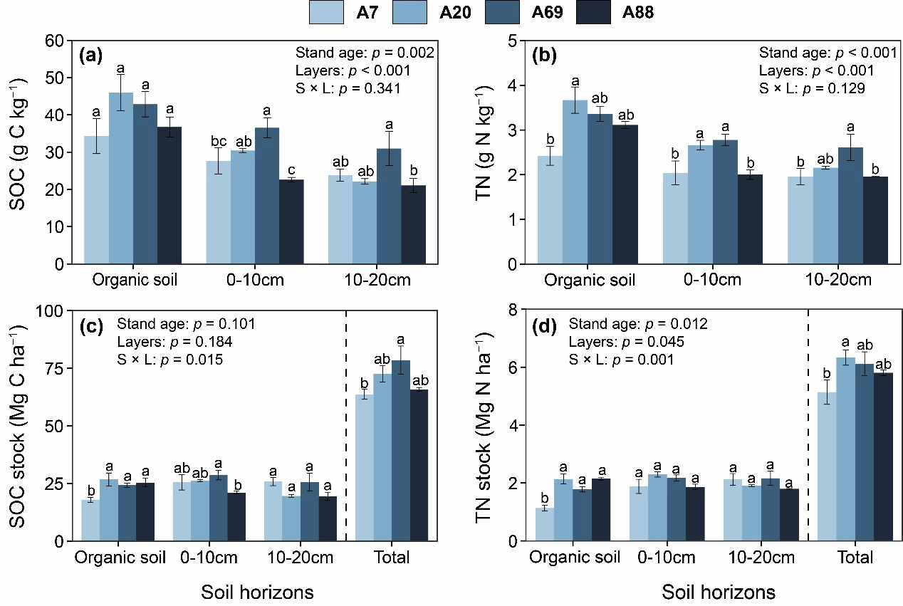 图 1 林龄对不同土层土壤有机碳和全氮含量及其储量的影响