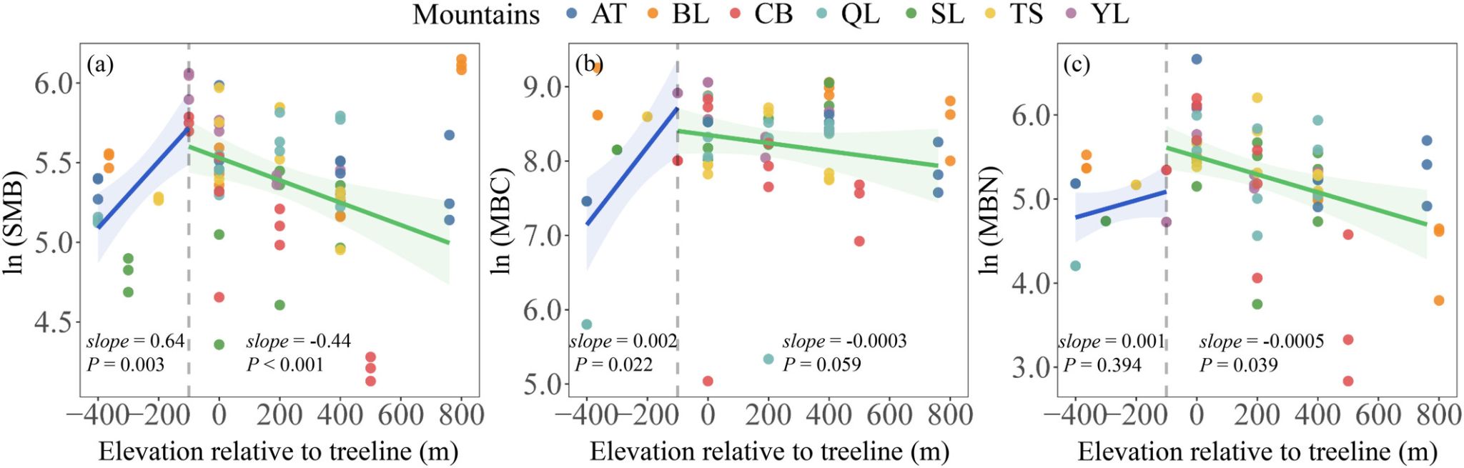 图2 土壤微生物生物量(SMB)及微生物生物量碳(MBC)和氮(MBN)对数转换后的分布模式沿海拔梯度变化