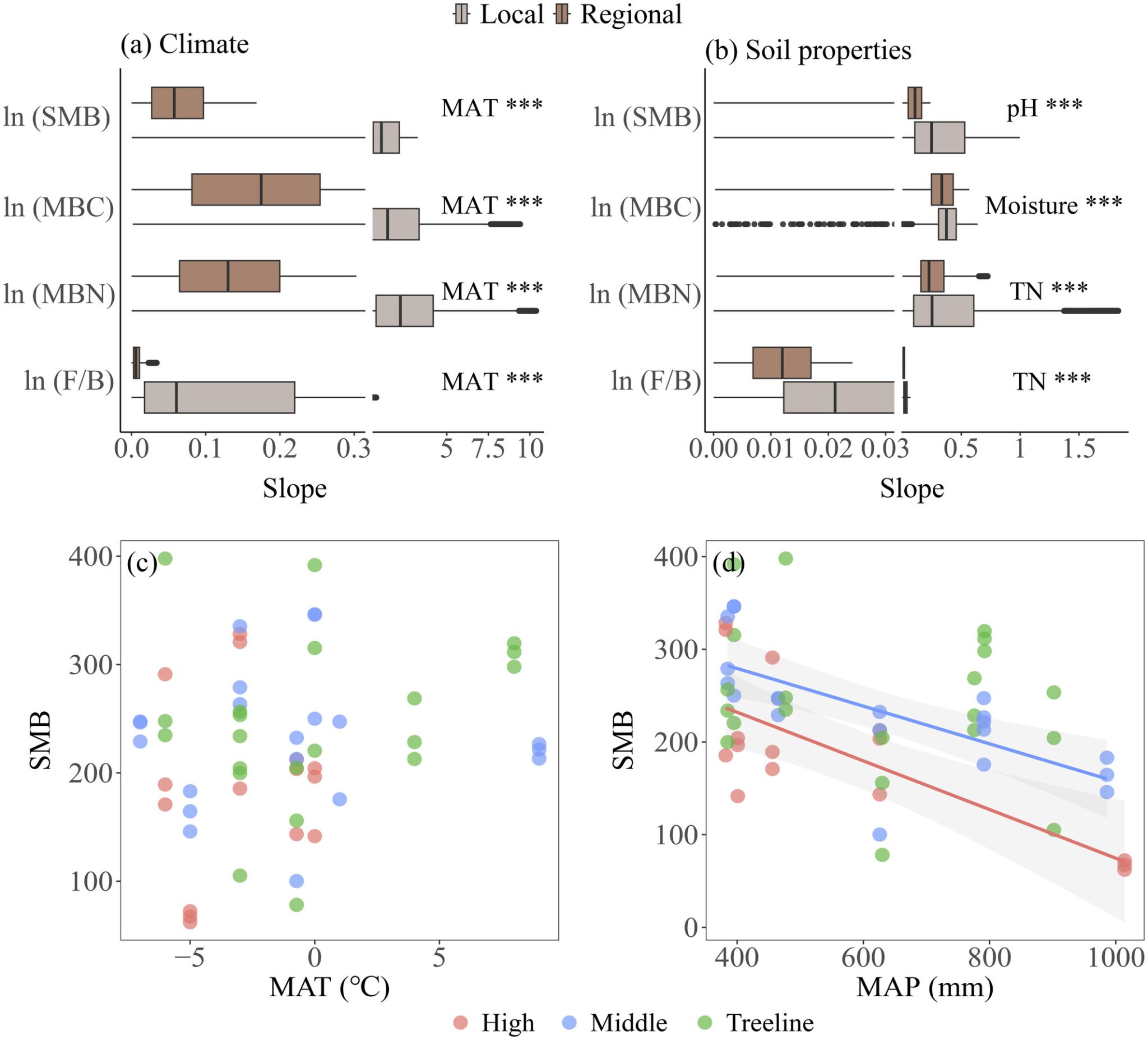 本研究发现SMB在林线附近达到峰值,呈“单峰”分布格局,林线成为微生物生物量变化的关键阈值。该格局与植物功能性状(如比叶面积、株高)的突变一致。在阈值以上,降水、土壤养分和水分是主要驱动因子;在阈值以下,土壤pH作用突出。局部环境因子(尤其是土壤和植被)对SMB的解释力普遍高于区域气候因子,且SMB对环境的敏感性在局地尺度(同一山地内)显著强于区域尺度(不同山地间)。研究强调,区分林线上下生态系统是理解高山土壤微生物分布规律的关键,为预测气候变暖与降水格局变化下高山生态系统碳氮循环提供了关键科学依据。