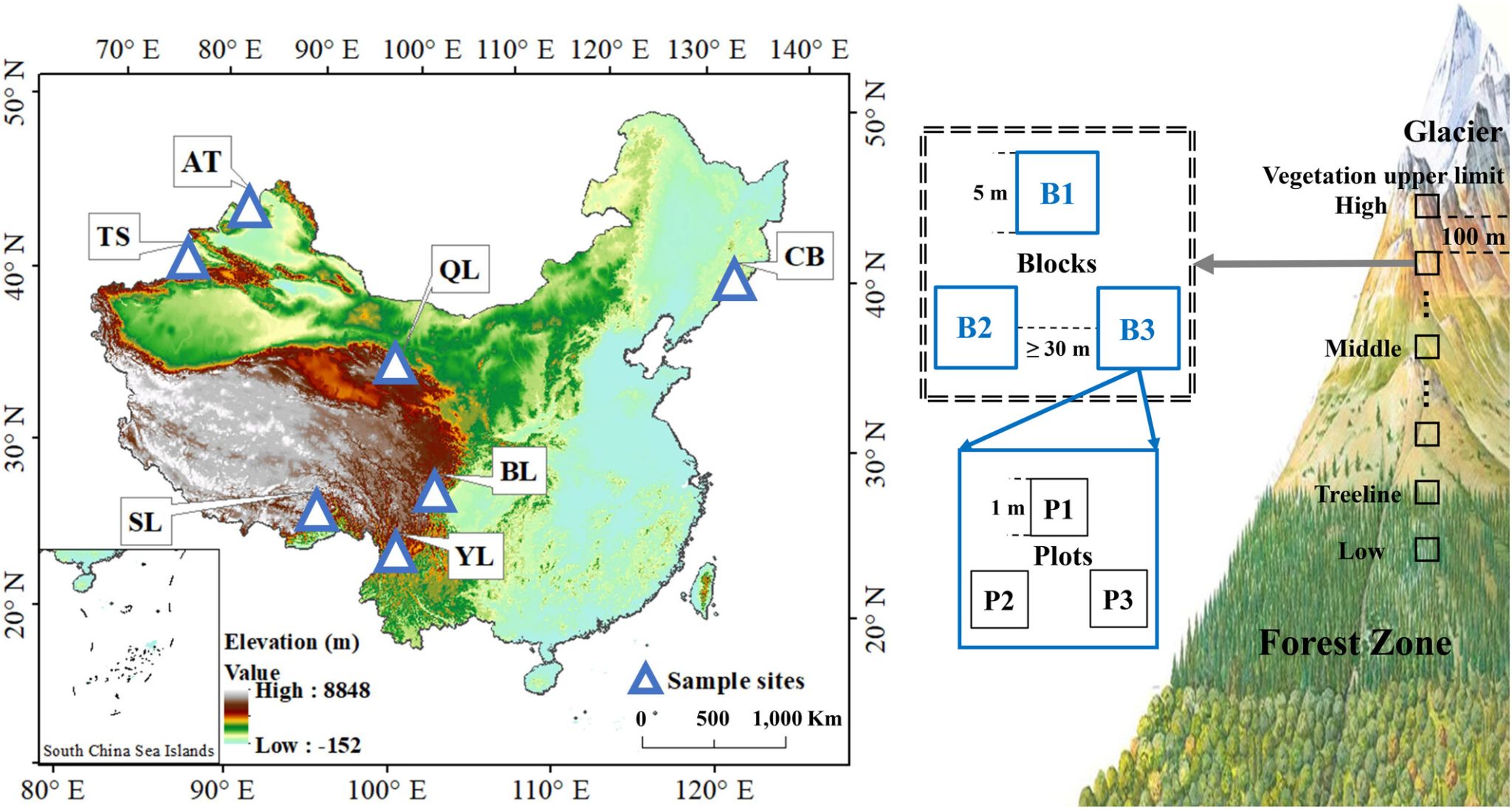 本研究旨在揭示中国覆盖温带大陆性、温带季风性、亚热带季风性、高原山地气候等四个主要气候区的七座山地中,SMB沿海拔梯度的生物地理分布格局,并量化气候、植被、土壤性质和地形等局部环境因子与区域环境因子(温度、降水等)对SMB及其真菌/细菌比率的相对影响。研究假设:(1)林线上下SMB分布模式不同;(2)局部环境因子(如植被、土壤、地形)对SMB的影响强于区域气候因子。
