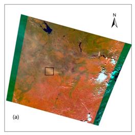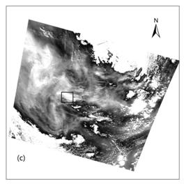 图1. 以2010年8月8日500米空间分辨率的GOSAT CAI数据为例对火灾的烟雾范围进行识别。(a)CAI 影像431波段组合,(b)CAI 波段1影像,(c)利用波段1阈值法对烟雾范围进行识别,(d)感兴趣区域(ROI)剪切后的烟雾范围,不同颜色代表不同的烟雾浓度。
