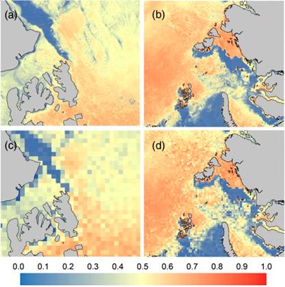 (a) 和 (b)为本文算法估算得到的反照率 (1 km), (c) 和 (d) 为CLARA 反照率产品 (25 km);(a) 和 (c)为 Banks, Prince Patrick和Melville群岛附近海域; (b) 和 (d) 为Kara海附近海域