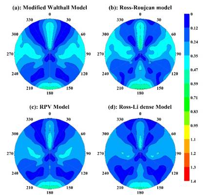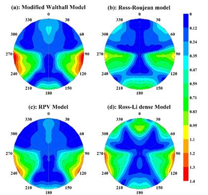 通过研究表明,植被偏振反射比可以用来计算镜面反射部分,将这部分镜面反射部分从总反射中减去,那么现有的双向反射模型可以以更高的精度来模拟漫反射部分。这种提升对镜面反射为主的植被覆被具有明显的效果。因此,这也为未来的研究提供了一个参考,即,把偏振反射比当成一种“噪声”排出来提升植被遥感模型的精度,可以将BRF模型计算误差从原来的30%(图2)减少到20%(图3),从而使模型在可见光波段有效的计算植被反射信息。