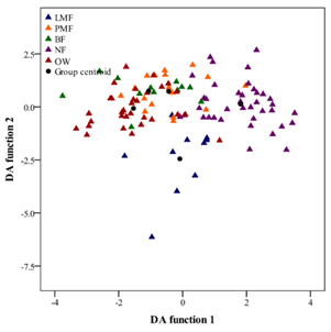 *LMF:落叶松混交林;PMF: 红松混交林;BF: 阔叶林;NUF: 林区非林下群落;NF:非森林区群落