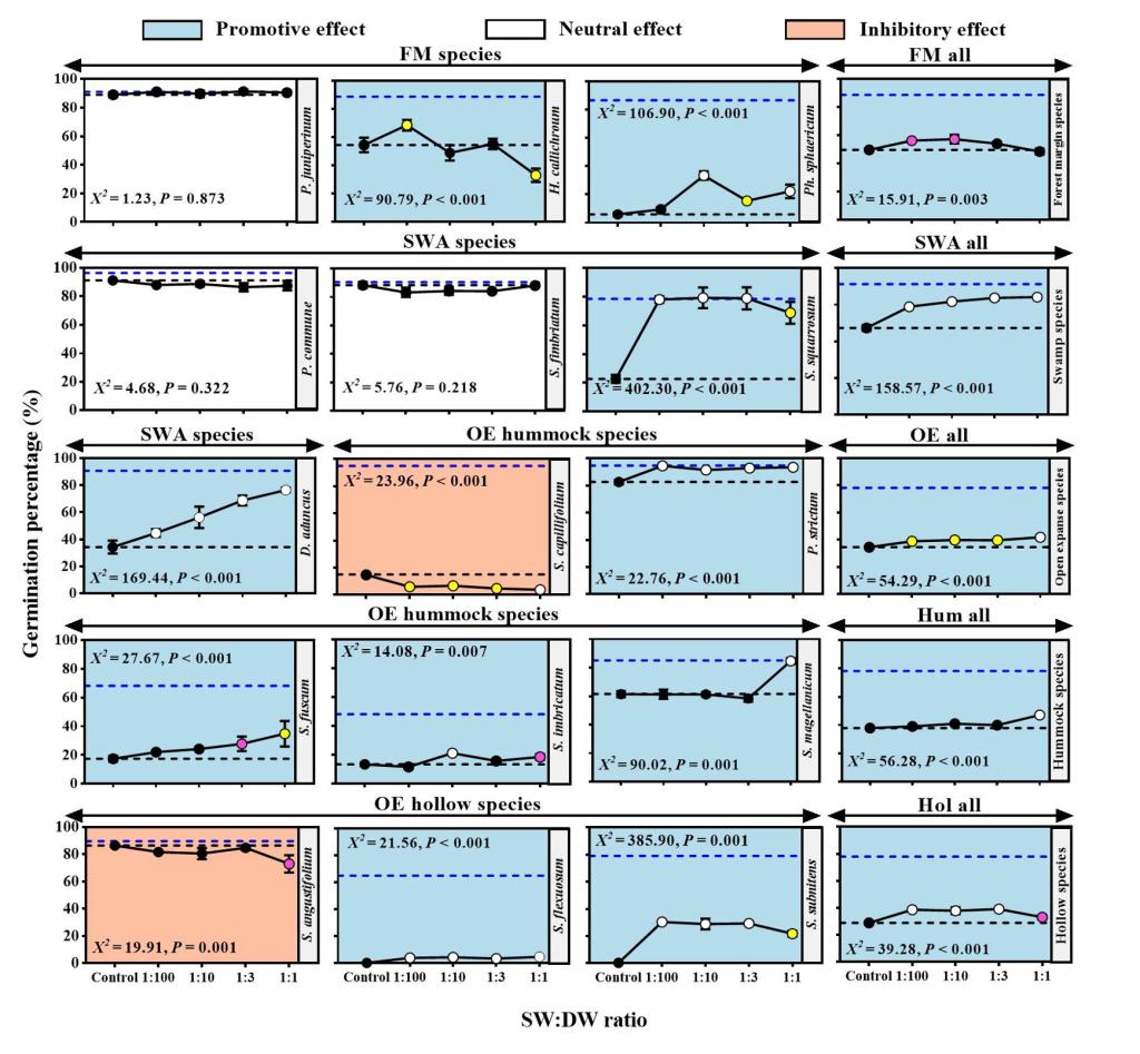 图1. 中国东北地区泥炭地15种藓类植物的孢子萌发率(GP)随烟溶液浓度的响应情况
