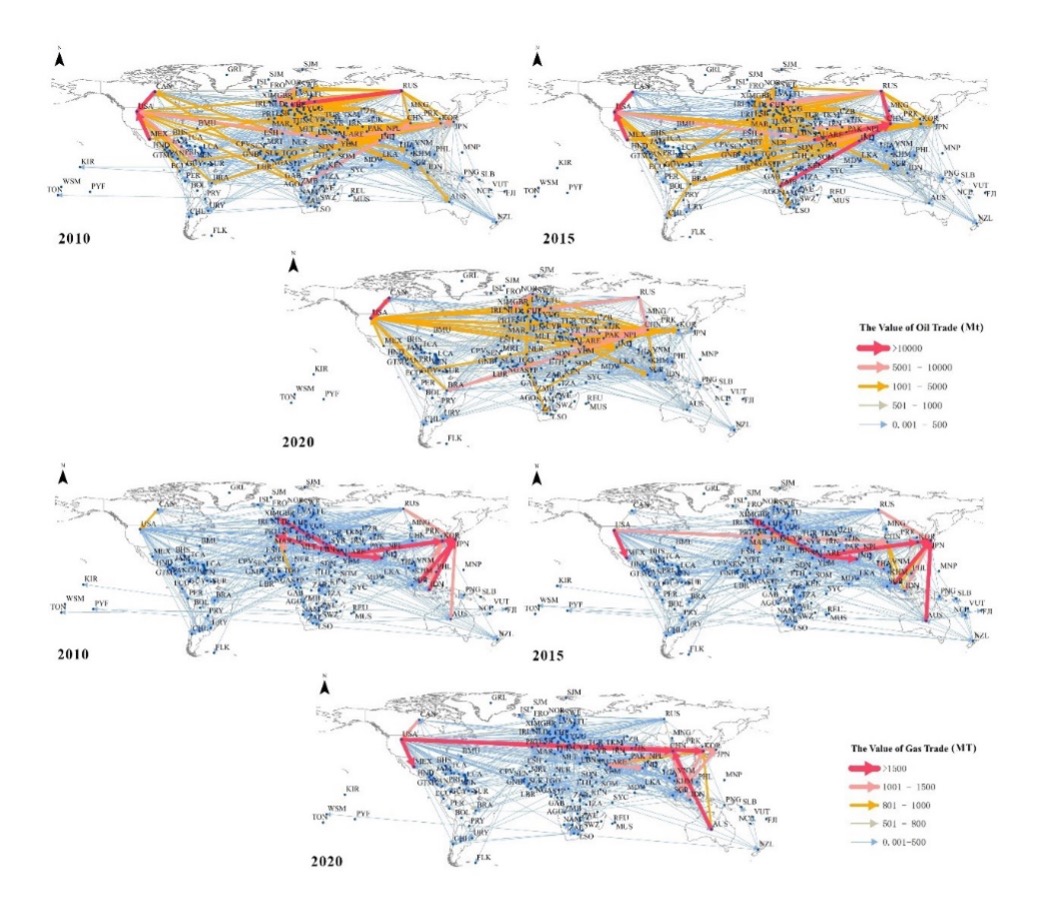 研究发现, 在2010年、2015年与2020年中,全球油气资源贸易网络联系呈现减弱趋势,天然气贸易网络的结构韧性高于石油。在抗毁性和恢复力方面,石油贸易网络具有较高的韧性,能够有效配置资源。此外,在随机攻击和蓄意攻击中,油气资源贸易网络结构韧性均发生显著变化。霍尔木兹海峡和马六甲海峡是油气资源贸易网络的重要阻塞点,这些阻塞点将影响全球能源贸易网络的结构韧性。核心国家和地区应该予以重点关注,这些国家供需的显著变化将对整个贸易网络产生重大影响。全球国家与地区之间应加强贸易往来,扩大全球油气资源贸易网络互联互通。