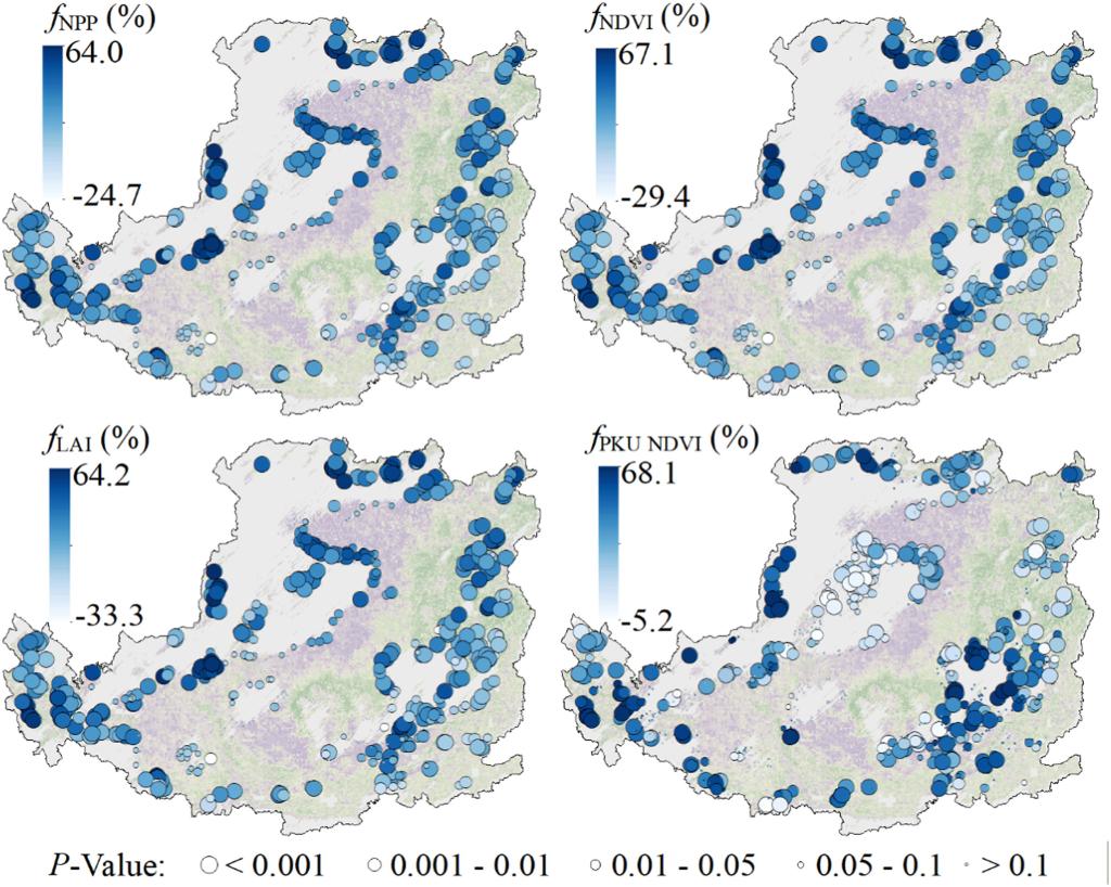 图3 VRPs导致NPP、NDVI、LAI和PKU NDVI变化的空间分布