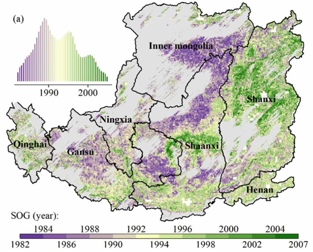 近几十年来,中国黄土高原的植被变绿主要受到一系列植被恢复计划(Vegetation restoration programs, VRPs)和其他自然环境变化(包括气候变化、大气CO2浓度上升和氮沉降等)的驱动。然而,由于缺乏不同地区VRPs政策开始实施的确切时间,准确估算自然环境变化和VRPs对绿化的贡献一直是一项挑战。