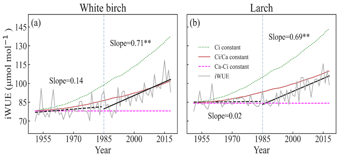 图2. 研究区(a)白桦,(b)落叶松内在水分利用效率(iWUE)的变化