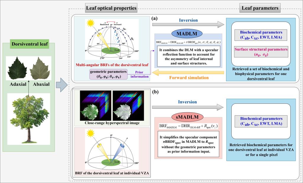 以上研究成果以“An advanced dorsiventral leaf radiative transfer model for simulating multi-angular and spectral reflection: Considering asymmetry of leaf internal and surface structure”为题发表于Remote Sensing of Environment期刊。我院博士研究生冉东杰为第一作者,孙仲秋教授和卢珊教授为通讯作者,东京大学名誉教授Kenji Omasa为主要合作者。该研究得到了国家自然科学基金、中央高校基础研究基金和吉林省科技发展计划项目等的支持。