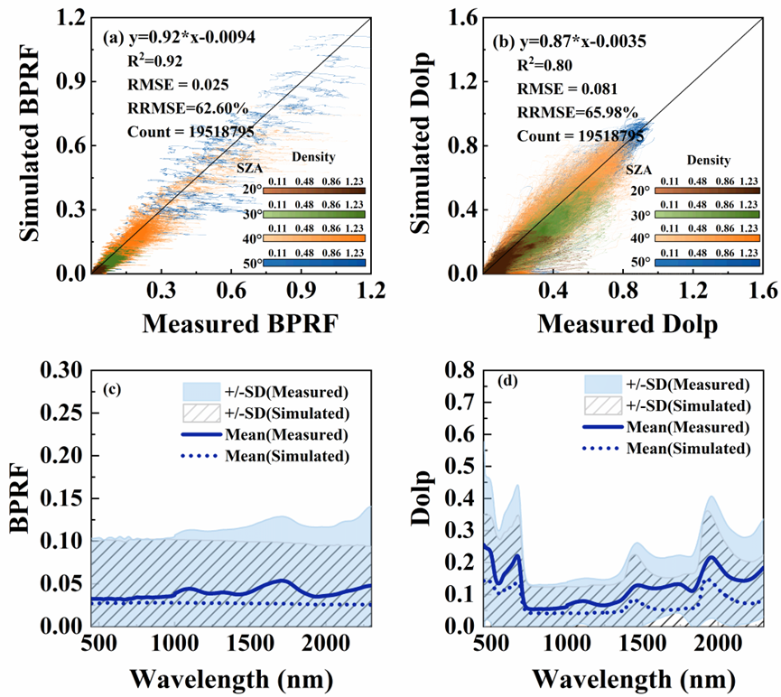 图3 PROPOLAR模型的偏振反射系数(BPRF)和线性偏振度(Dolp)模拟精度图((a-b)测量值与模拟值的比较,