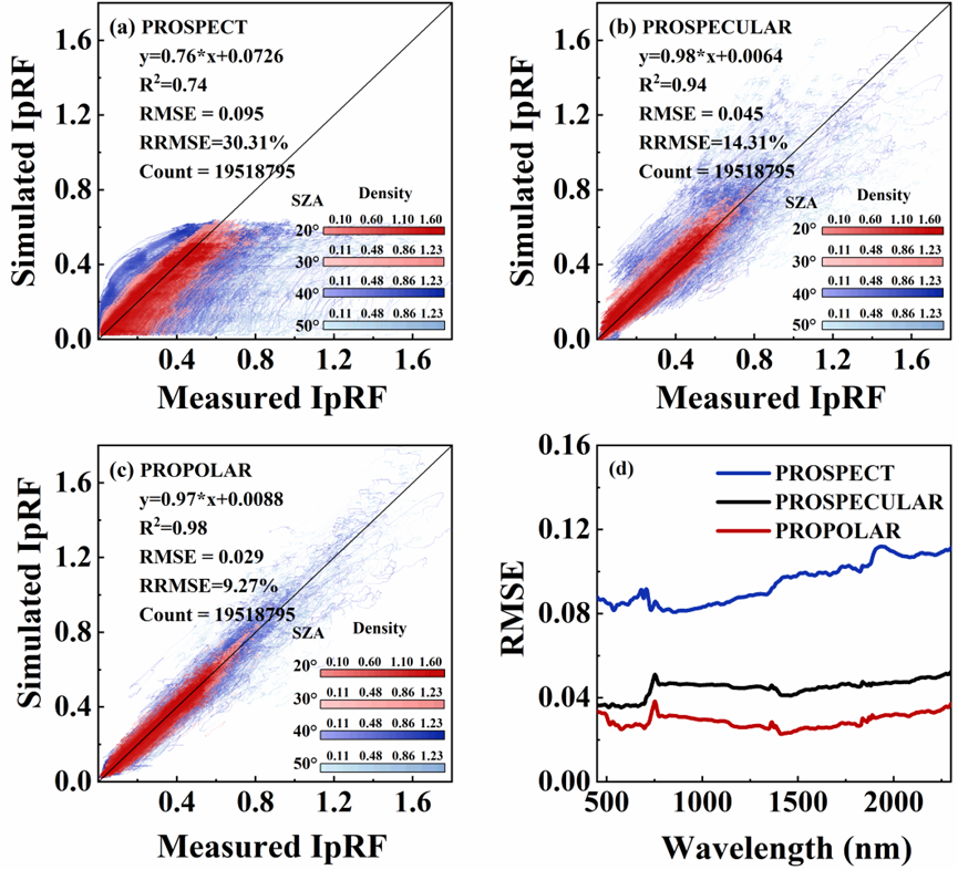 对于反射强度(IpRF)的模拟表现比较图((a-c)测量值与模拟值比较,(d)不同波段上的均方根误差)