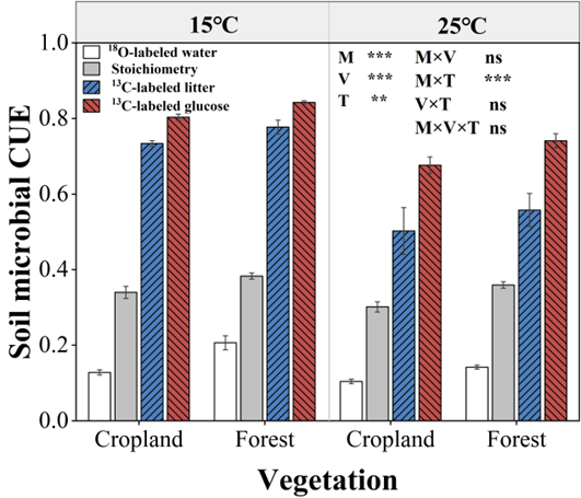 图1 用不同方法估算植被类型和培养温度对微生物CUE的影响
