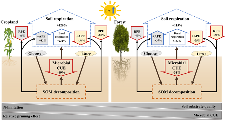 图3 农田和森林土壤微生物CUE、激发效应和土壤呼吸响应温度升高的概念图